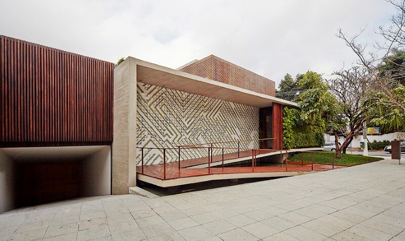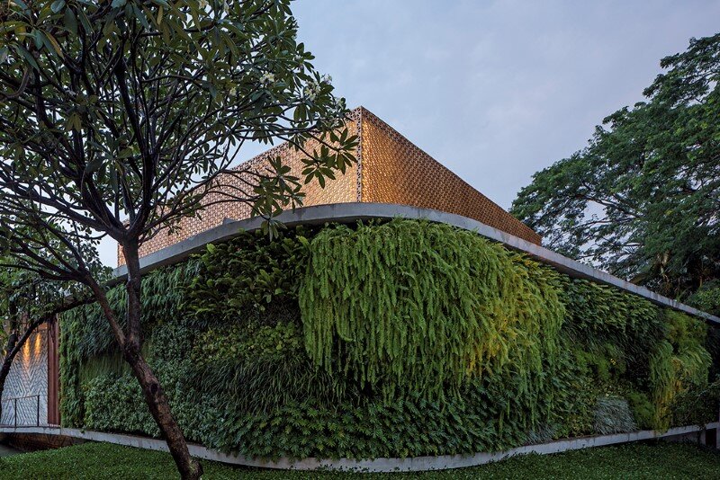 The façade in concrete, finely textured, works as a mediating skin. It frames the wide ceramic tile panel and the large vertical garden. The large green wall round the corner, where it wraps and stretch to the other opposite side of the plot. The constructed surface area of 1.200 sqm is distributed among the ground floor, the upper volume, and a semi-underground floor, where the garage and facilities rooms are placed.