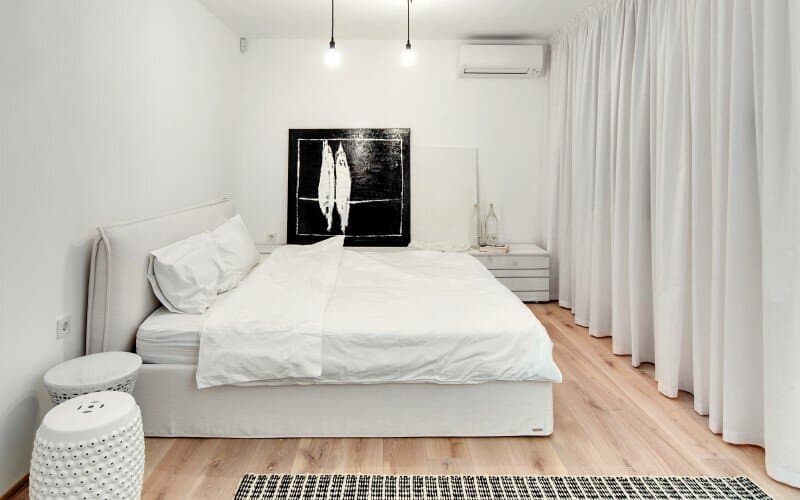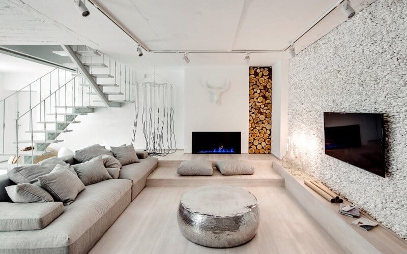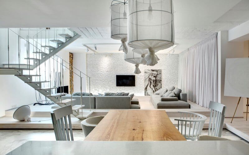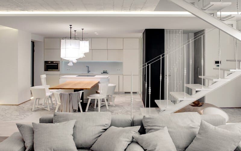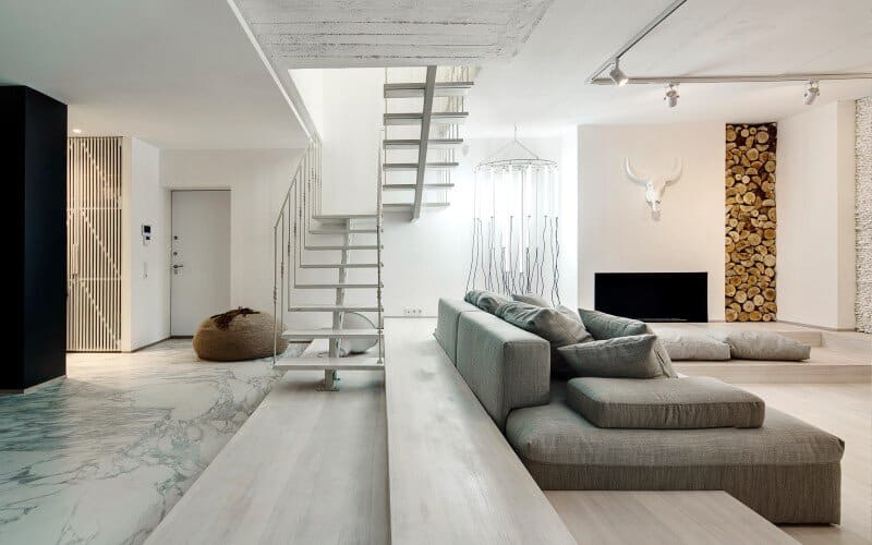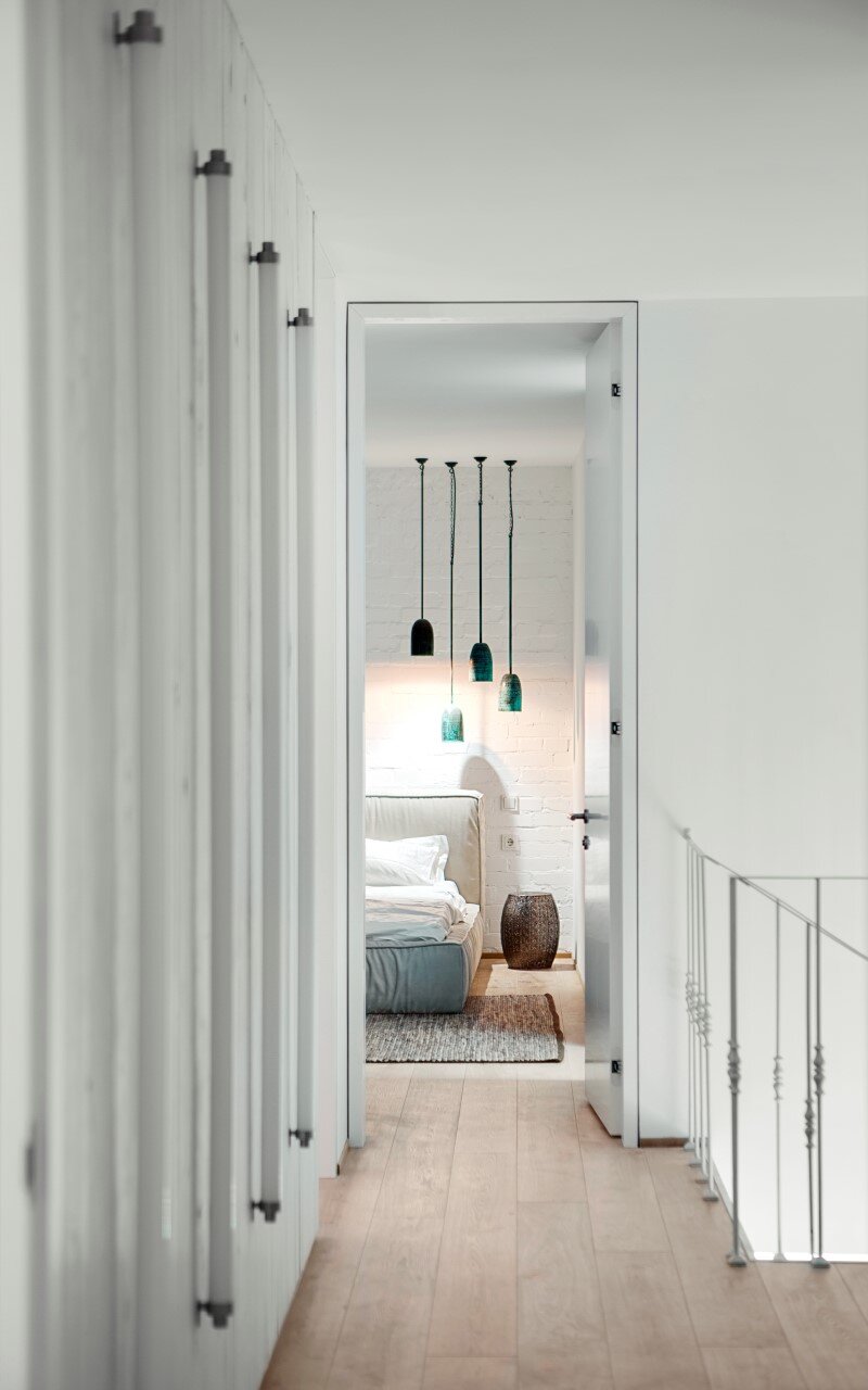 Guest bedroom is as white as the rest of the interior. We decided to refuse from the closed walk-in closet and used a well-known technique, where instead of the hanging rod for the clothes a tree branch was used. The entire interior of this duplex apartment was implemented in 8 months. The key point in this interior is the overall harmony. Peace of mind is the topmost idea of this interior – and this state has been a long-run objective of the Customer and of the project authors – FORM bureau. [Via email – Courtesy of FORM Architectural Bureau]