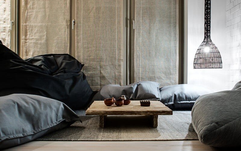 Countertop and worktop of the island were made of a faux stone, mounted by the company Love Stone. On the wall near the kitchen the mirror was glued, expanding the space. Black wall was painted with chalkboard paint designed for writing with chalk. Ceiling in the kitchen area and in the dining room was lowered not only to build in light fixtures and to provide light to the common room, but also to hide the ventilation. On the floor we used tiles REX of 1700mm x 900mm size. Originally, there was one long loggia on the ground floor. We divided it into two parts by using a glass partition. From one part of the loggia we made a children’s play area, and the second part we decided to make tea and hookah area which we closed by a glass door. That area appeared to be very cozy.