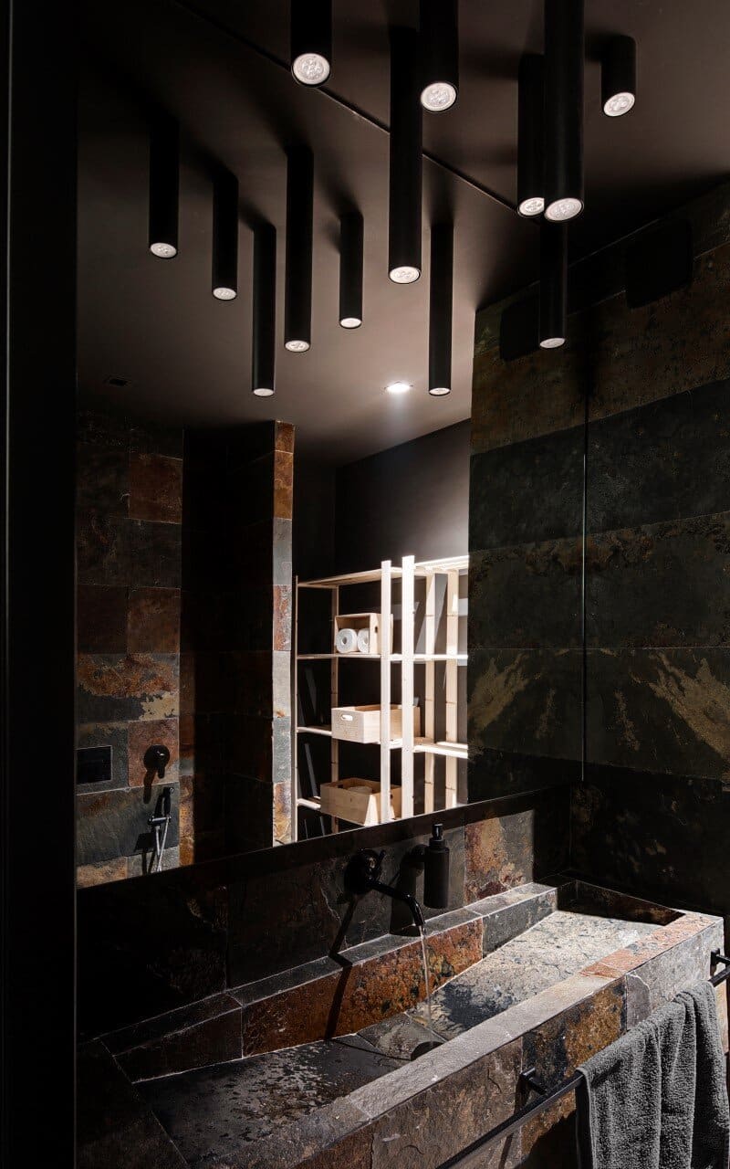 Sanitary room on the ground floor we wanted to make sort of mind-blowing with interior of white color in the background. For this purpose we choosed natural stone cut in imitation of the tiles, (L’Antic Colonial). Behind the rack doors we installed the household case. One of the most difficult moments that we faced was to find sufficient number of coins with nominal value of 25 kopecks (we had to visit more than one Oschadbank in Kiev to buy them). There are about 4 thousand hryvnia in total amount.