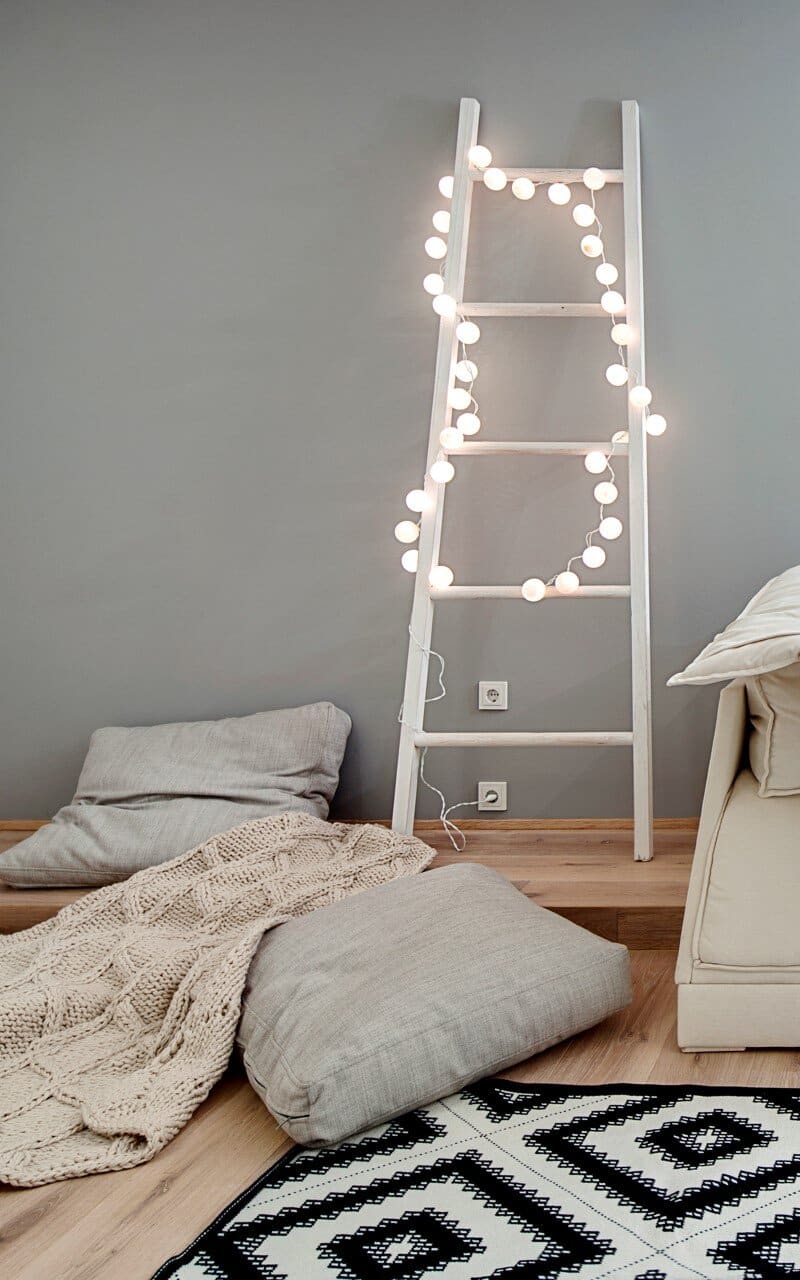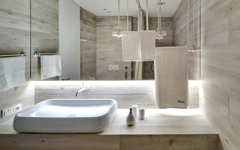 Our original plan was to make the ladder very light and airy. We welded metal frame and installed wooden stairs on it. We painted the stairs white and slightly aged them. Hand railings were welded from fabricated drop-forged parts and painted white. On the first floor all the doorways were raised up to the ceiling. Wall finishing in the lobby was made with boards which were aged artificially and painted white. Lamps were manufactured by “My Light” according to the drawings of the project authors. In the sanitary rooms we used large mirrors to expand the rooms visually. Instead of usual towel holders we used a tree branch, which was painted white and hung on the ropes.