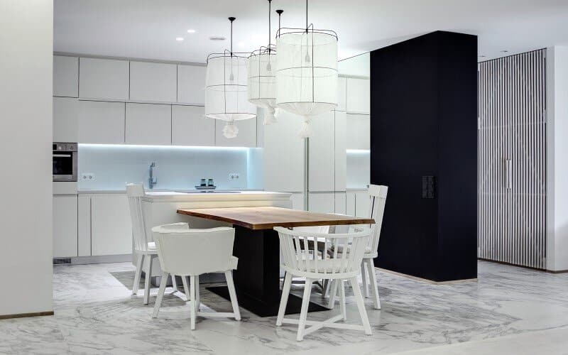 White color and authentic simplicity became the framework for everything. For contrast we used shades of black color only in details, the warmth was added by a natural wood on the floor. Architects worked mainly with Ukrainian manufacturers on this work area, with the exception of the chairs in the dining area (Gervasoni from Italy), and some of the light fixtures and decor imported from Bali.