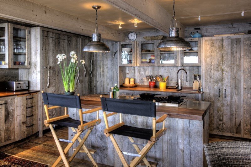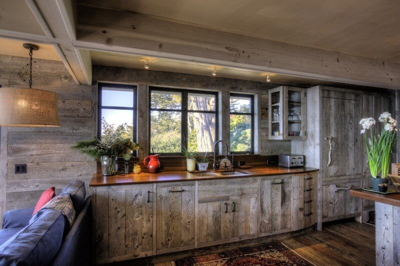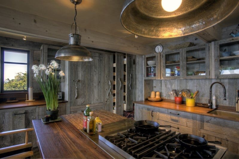 The soft grey barn-wood planking segues into the main sink work area with views of Santa Rosa island and the owners’ favorite cypress. Reclaimed hand hewn Indonesian teak countertops and splash provide a warm working surface and protection from sink splashing.