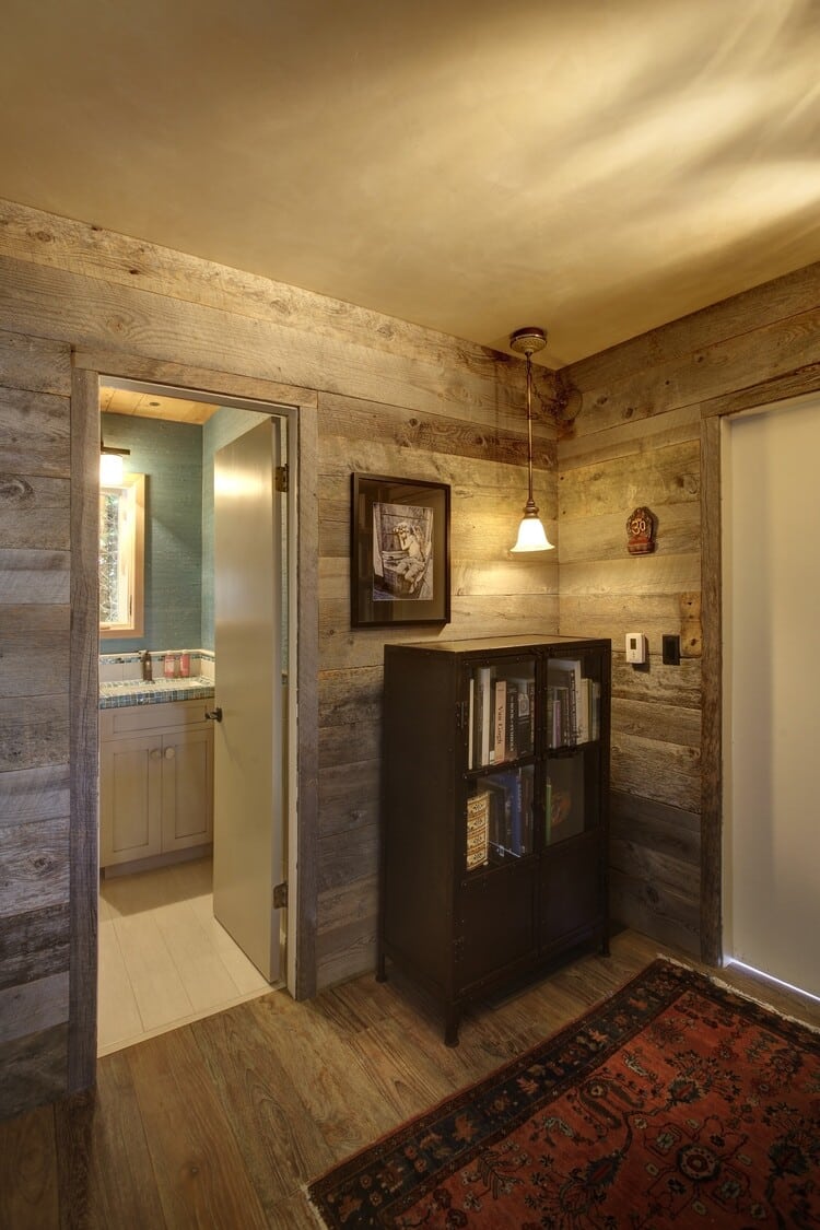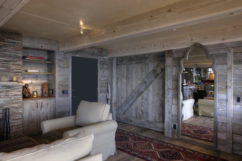 All the exterior surfaces of the cabinetry, columns, walls, doors and trim are reclaimed California Douglas fir barn wood. This required exact hand work by our team of talented cabinetmakers and carpenters. Every board was selected for its color, grain and texture to work with its adjoining neighbors, inspiring everone from the owners to craftsmen.