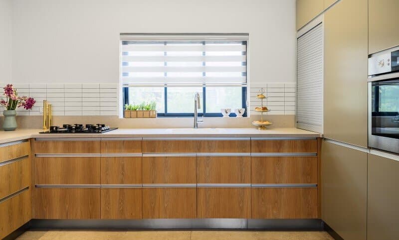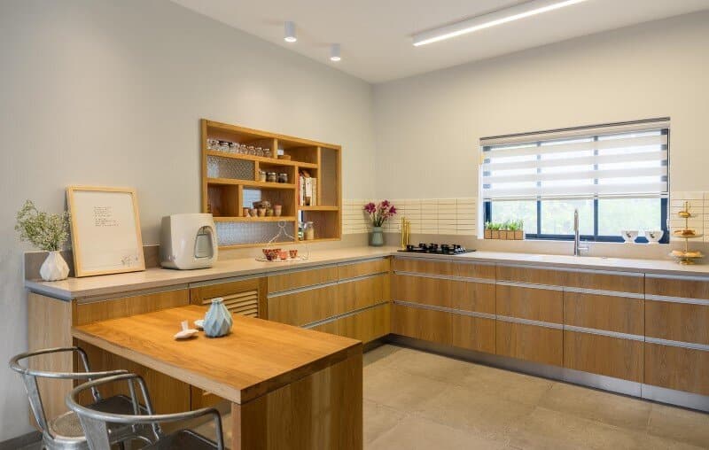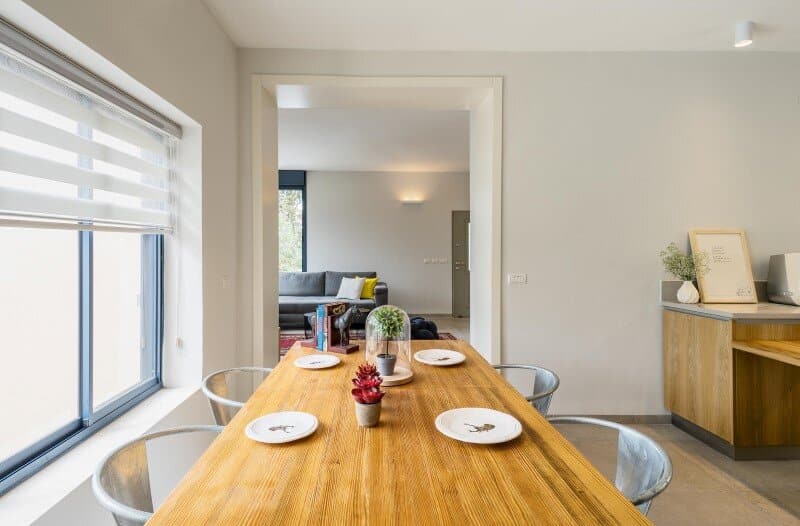 By connecting and expanding the public area, we designed one unified shared space. Opening a “window” between the kitchen and work room enabled an expanded view while also serving a dual function. Firstly, to extend vision of the internal living space and secondly, to offer a vista from inside to the outer green landscape.