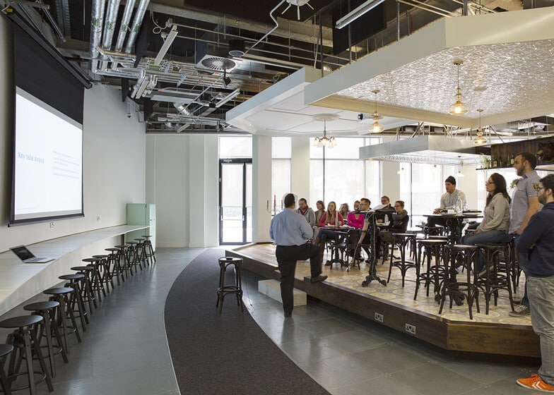 From the entrance, the theme is reflected through the reception area, decorated in the form of an Irish pub with a horseshoe-shaped bar. The traditional color of Ireland, green, is more present in the decors, inclusively the two telephone booths that have a decorative purpose. Concerning for the natural look, in order to create a warm and pleasant atmosphere, suitable to the specific activities of the company, Heneghan Peng has chosen to use as raw material wood and its derivatives. Along the main access corridor, on both sides, there are organized versatile offices with a design inspired by various properties of Airbnb from all over the world. The main meeting hall resembles very much like an university auditorium, but in this hall, the order word is convenience and creative freedom. Airbnb office from Dublin is in the final phase of work and will be officially opened on 4th April.