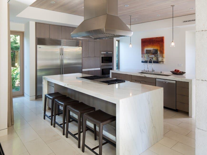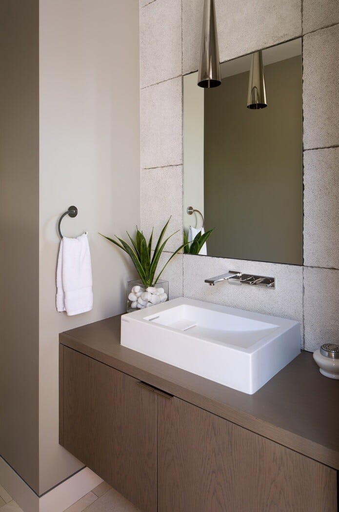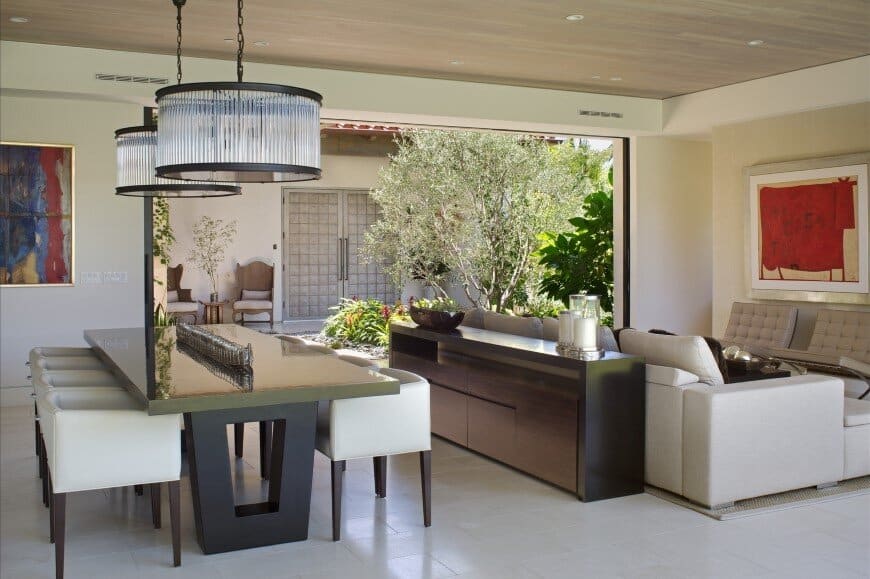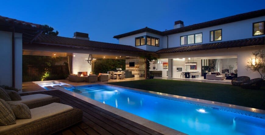The architect’s description: The inspiration for the Aire Libre residence stemmed from the homeowner’s love of outdoor living, which is perfectly matched with our mild, southern California climate. The entry courtyard immediately surrounds the occupant with a lush garden, and the interplay of garden areas with living space continues throughout the home. Extensive pocketing glass doors provide a direct connection to the outdoor areas, blurring the lines between indoor and outdoor space. A large roof connects the guest house to the main home, thereby creating an ideal location for a covered outdoor living environment. A linear pool and spa accentuate the outdoor living area and pass underneath the roof cover above.