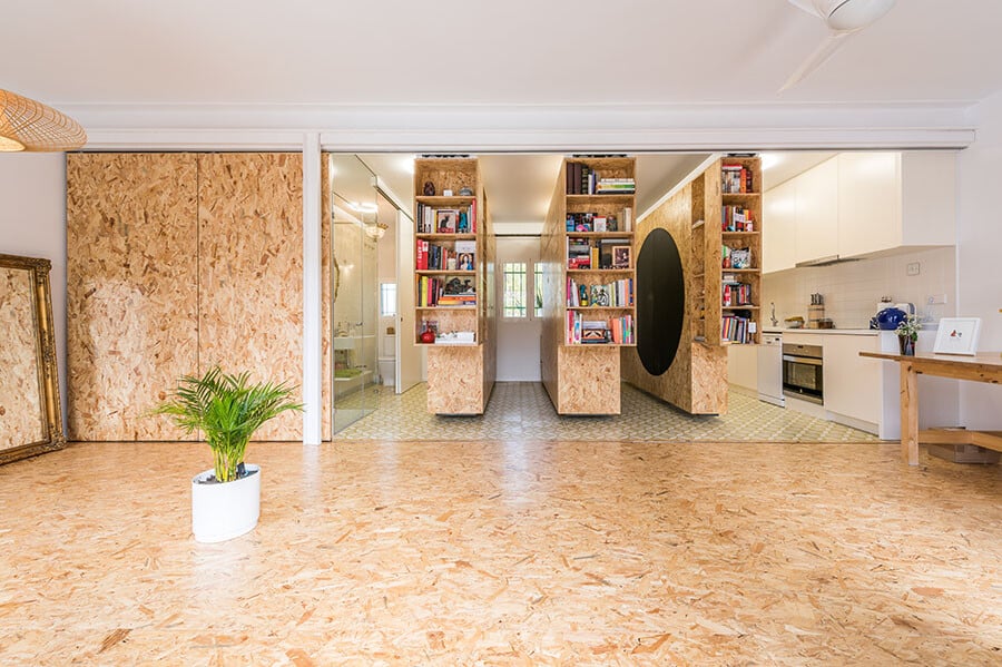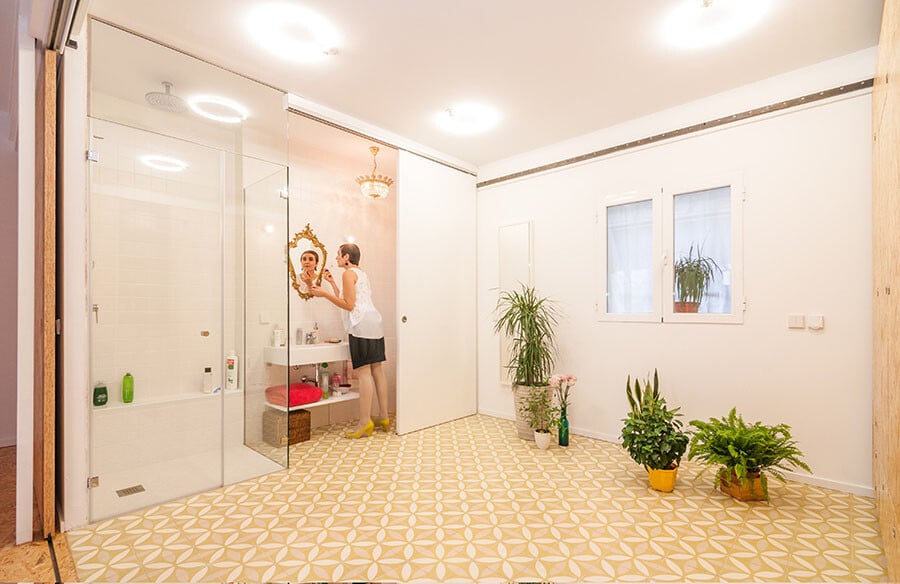 Using a combination of a simple industrial railing system with joinery, the space where both the household activities and the office take place was arranged by using three hanging, mobile and convertible wooden containers. Depending on the owner’s needs, the mobile compartments can be arranged in a few seconds, whether it is wanted the access to the shower, kitchen, library or wardrobe. In case the designer has scheduled a meeting with a client, all modules can be gathered resulting in a large space for the office. Thus, Yolanda’s house, suggestively named All I Own House, is divided by family, friends and clients. The warm and welcoming interior, “dressed” in wood, is prepared to offer a variety of combinations suited to the owner’s needs.