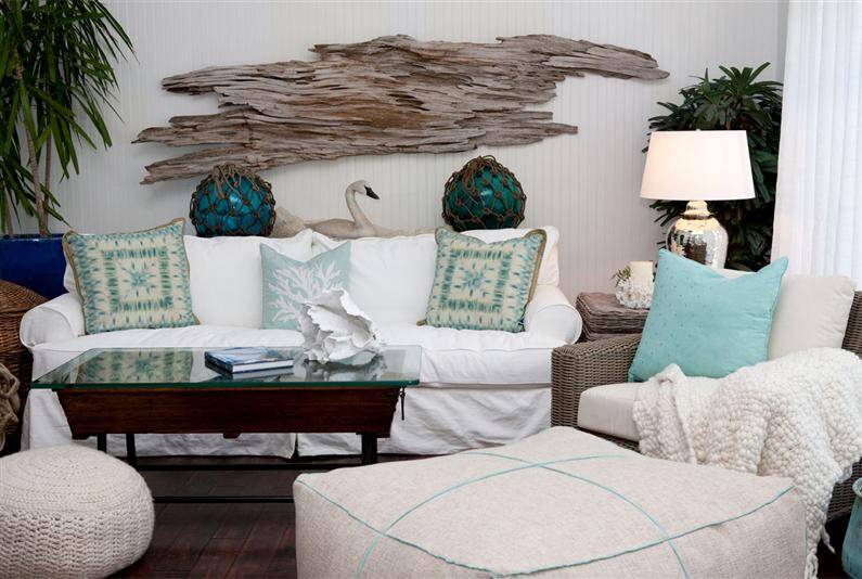 – specific colour shades and tones of the ocean and sky, with focus on white, blue, oceanic green and sandy beige. The wood decors are usually in contrast with these light colours having darker tones;