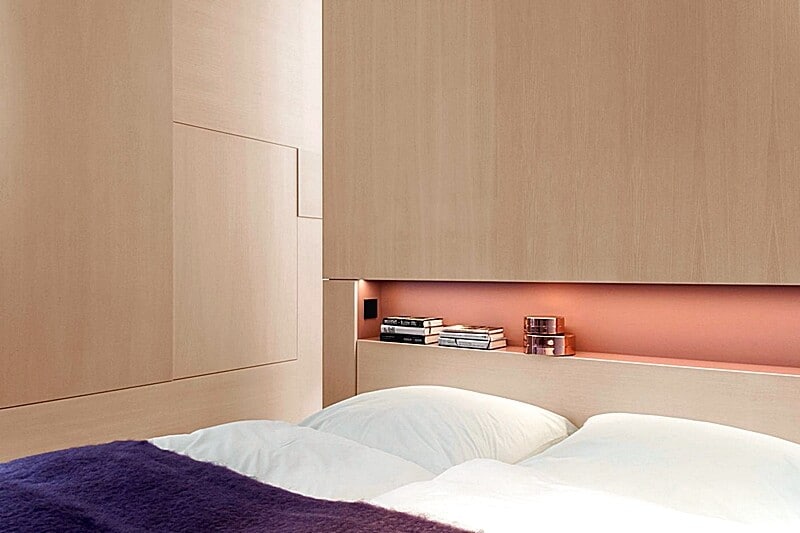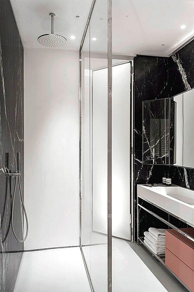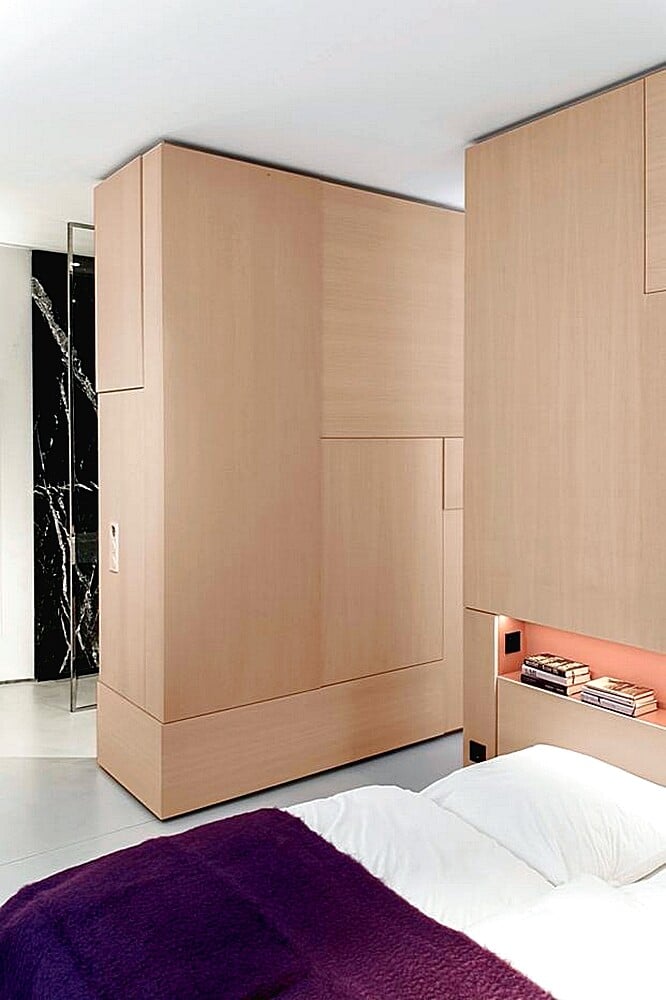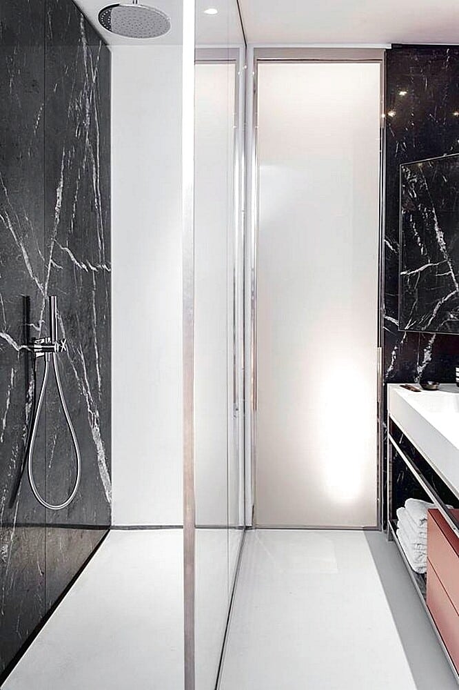 Sleeping and bathroom zones flow one into the other – the bath is freestanding and the level-access shower is simply bounded by a chrome-framed glass wall. The custom-built corean washbasin is mounted on a glossy chrome stand. The walls and built-in cupboards are clad in ash or large format marble slabs.
