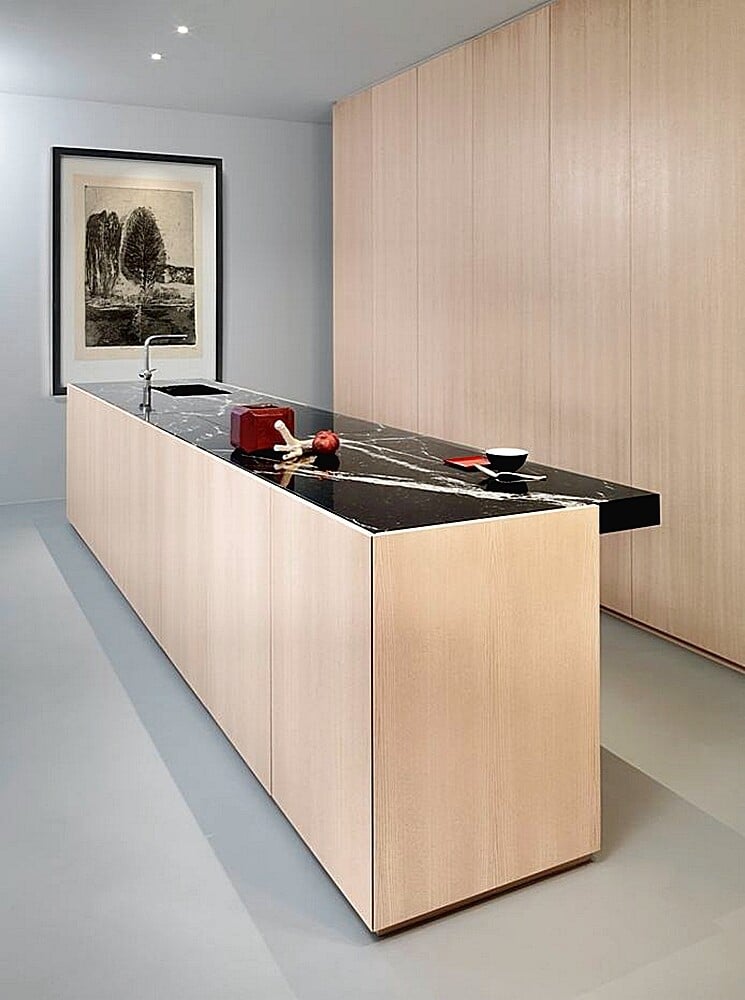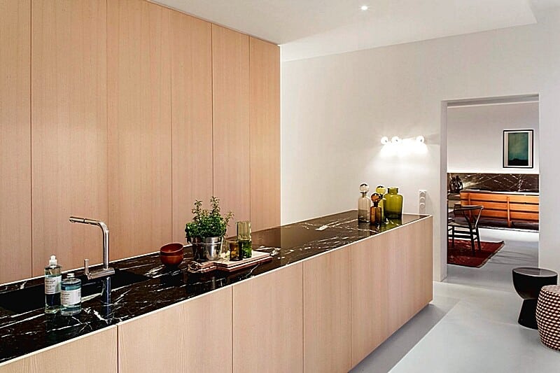 Clear gallery-style rooms are the result, whose character is accentuated by a minimalistic lighting concept from PSLAB. The furniture and fittings are positioned like exhibits in front of the sheer white walls. A pale grey concrete floor is combined with soaped ash and nero marquina marble in the kitchen island and the bathroom, as well as for the long bench in the living room. Between the kitchen and the entrance hall stands a “box” containing wardrobes, kitchen cupboards and a mirrored cloakroom.