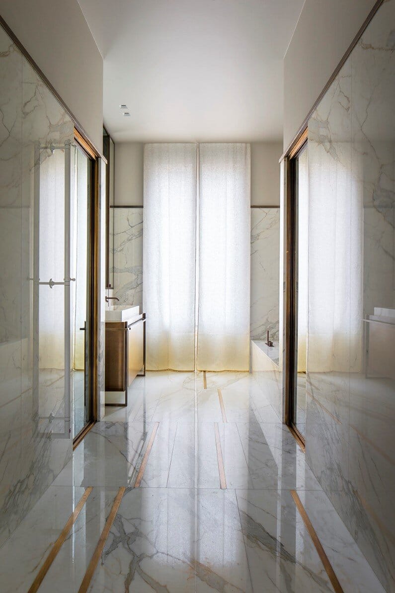 Central to the design ethos is the juxtaposition of noble materials, each carefully selected to evoke a sense of timeless elegance. The marriage of lustrous medal brass and exquisite Calacatta Caldia marble serves as a signature motif, weaving a narrative of coherence and sophistication throughout the living spaces.