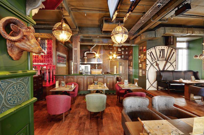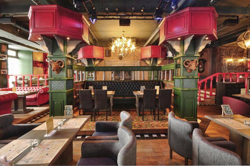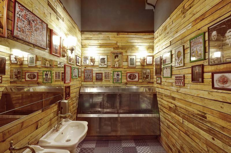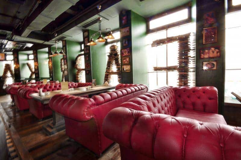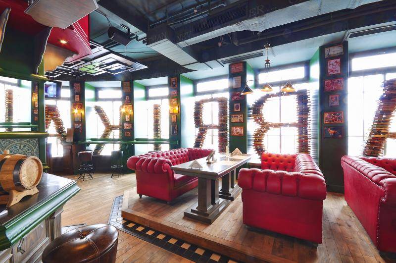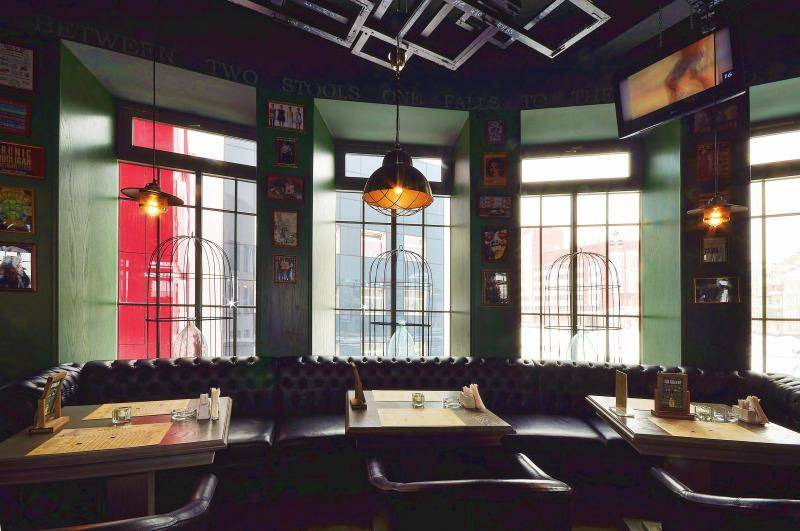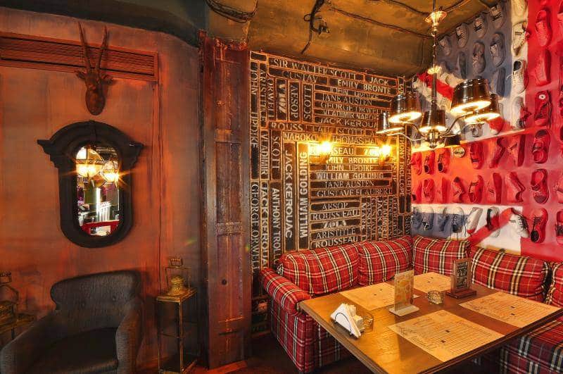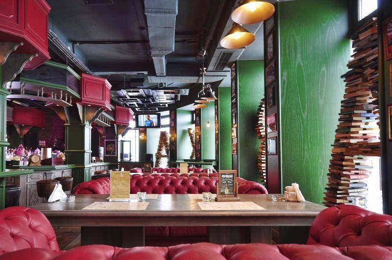 Restaurant Hotel attention to detail. All decor items collected from the most unexpected places, including art objects, like caps FABRIKA of 3,000 English books on the windows, the wall of the British shoe in the color of the British flag, great retro cells manufactured by forging iron within which “sit” under the big bottles of liquor, pictures of meat and minced meat, photos obese people, busts of prominent figures of the past century and retro skates in the locker room, and the staircase of the ancient rulers. In general, the space has a memorable picture and its own history.