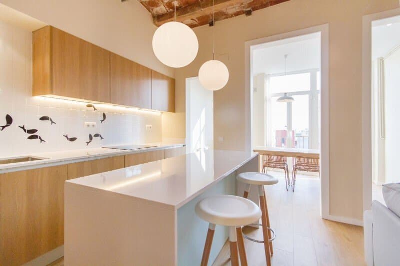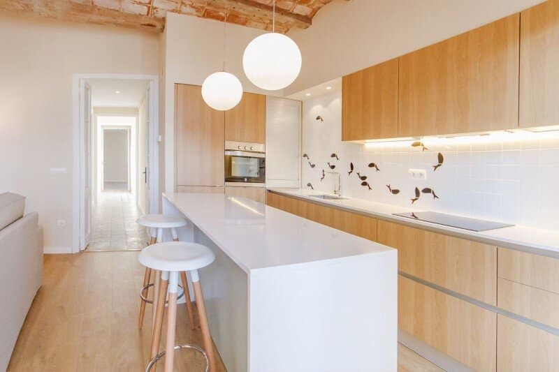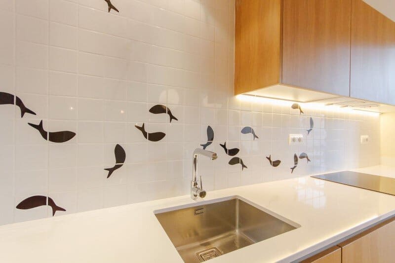 We’ve restored the floors, painted ceilings, moldings and furnished it with charm and simplicity. In the kitchen it is where you find the more detailed design. Open to the living room with a magnificent celestial island and a white Silestone countertop in perfect contrast with natural oak furniture and a fun white tiles with motifs of fish.
