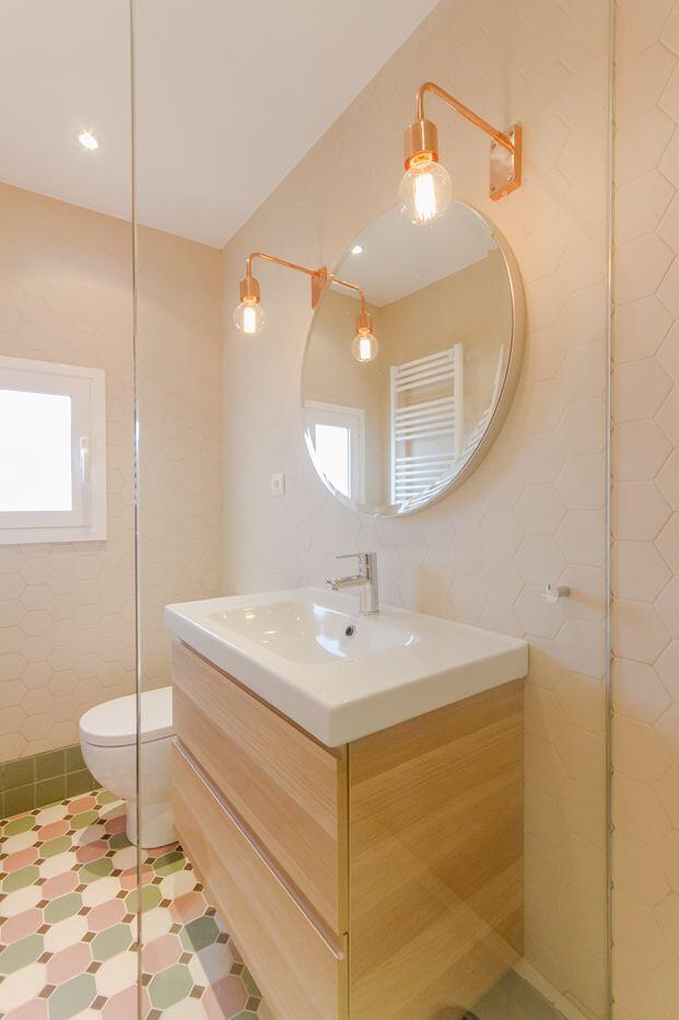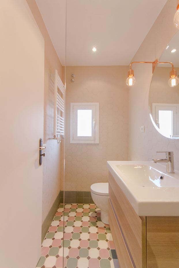 In the bathrooms we continue with the modernist aesthetic and draw mosaic floors combined with beige, hexagonal and square tiles on the walls. You will never be bored here!