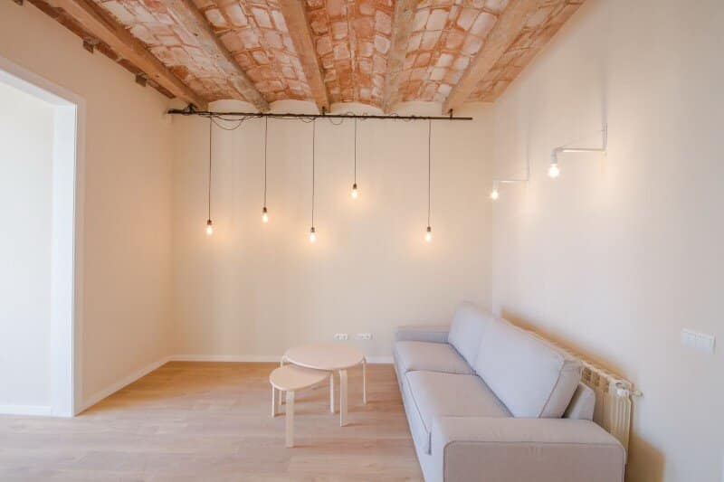 Another special detail are the lamps. The room is lit with sconces and an invention of a curtain rod with suspended bulbs give rhythm and joy. The result is a floor of 85m² rented twice its initial value and in only one week. For more information visit Piedra Papel Tijera Interiorismo