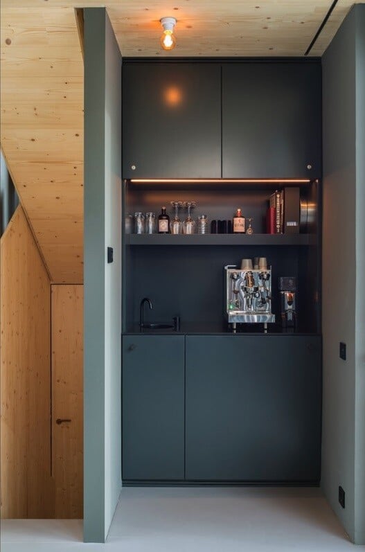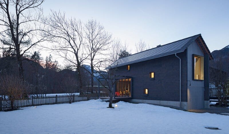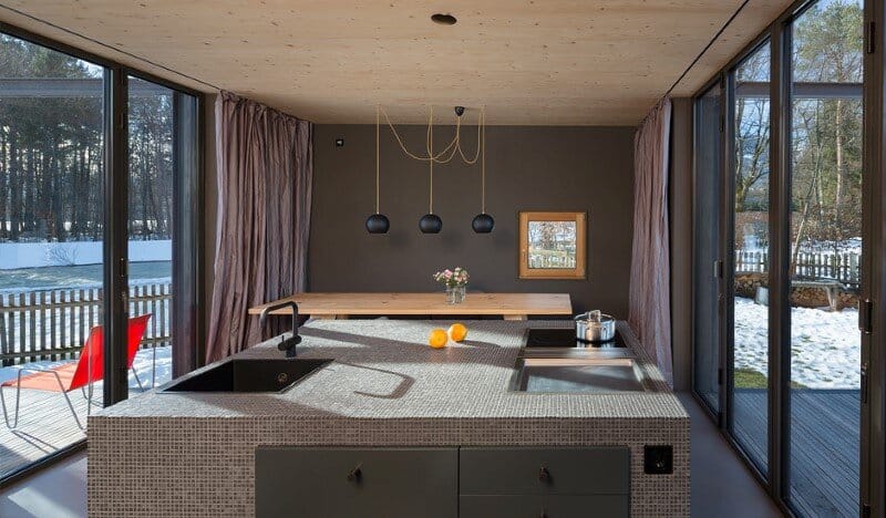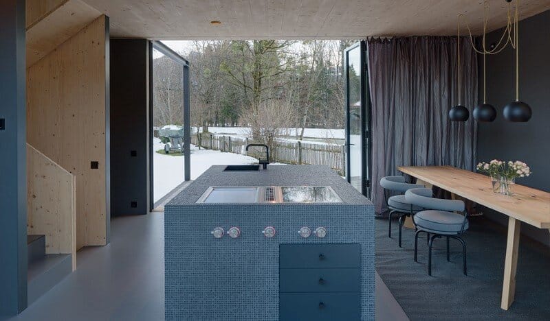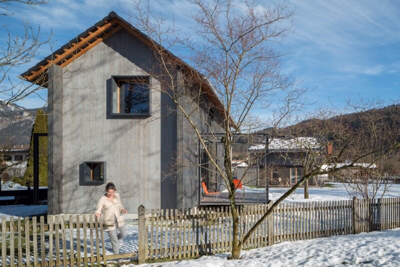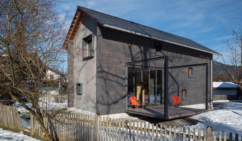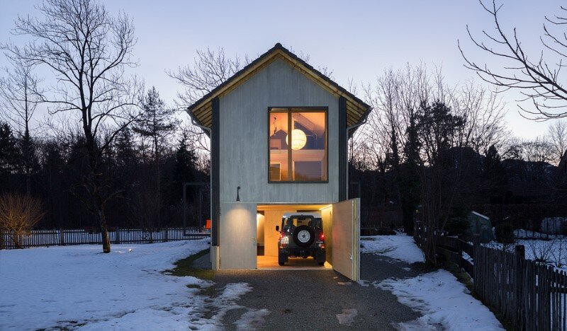 The holiday home situated in the Upper Bavarian Inn Valley is only 4 meters wide. The architects Christine Arnhard and Markus Eck have built it for themselves according to their own wishes and ideas. The house with solid walls of wood and clay is like a loft on five levels: the half-offset stacked rooms are openly interconnected. The entrance area with garage leads into the dining kitchen, which can be opened with large folding doors on two sides.