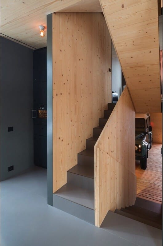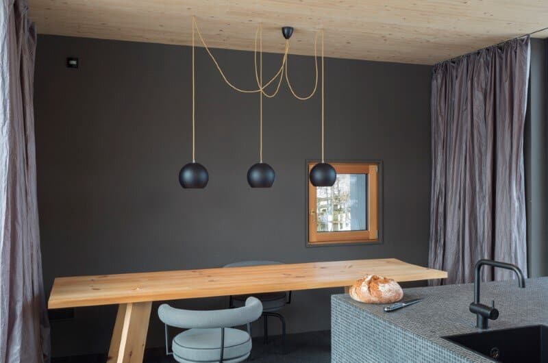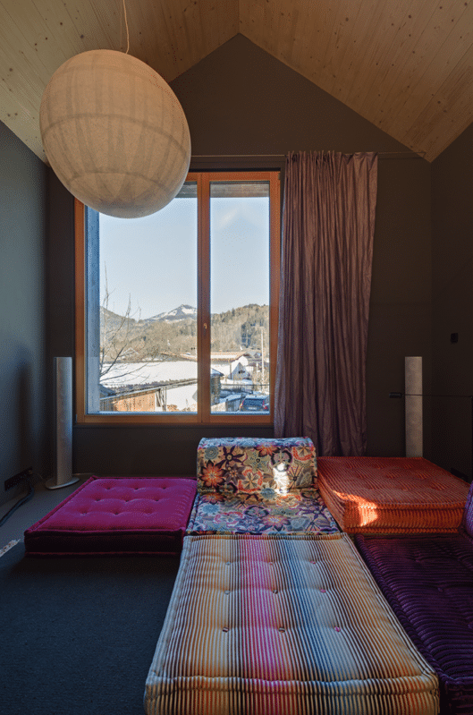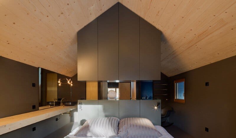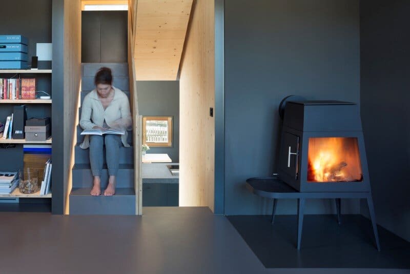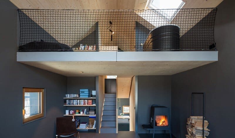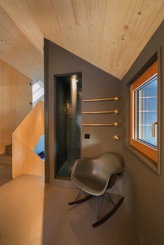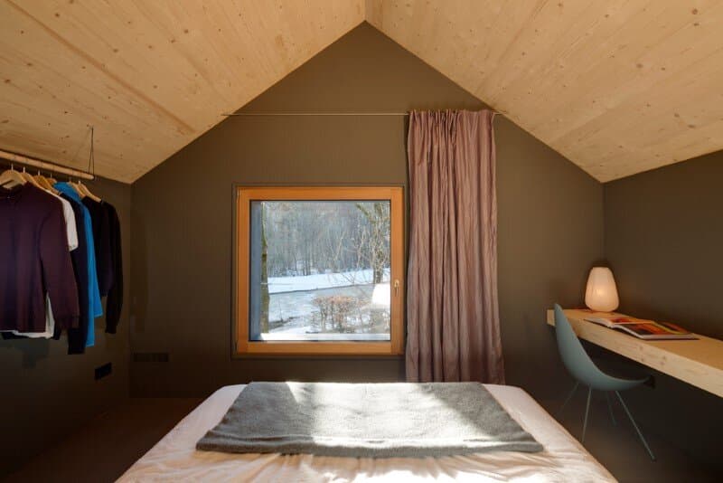 Two floating terraces extend the interior space outdoors. The living area with fireplace and views on the Spitzstein is located half a floor above. The bedroom with views of the creek “Auerbach” is on the next level and further up is the gallery under the roof with freestanding bathtub and sky view. For more information visit Urlaubsarchitektur and Holzhaus am Auerbach