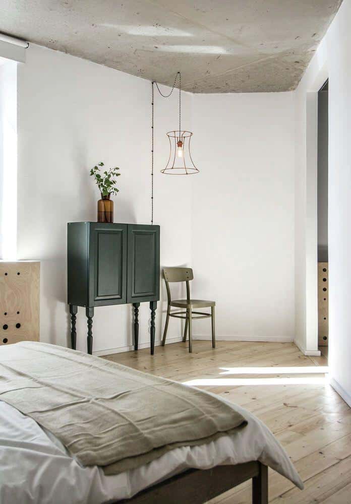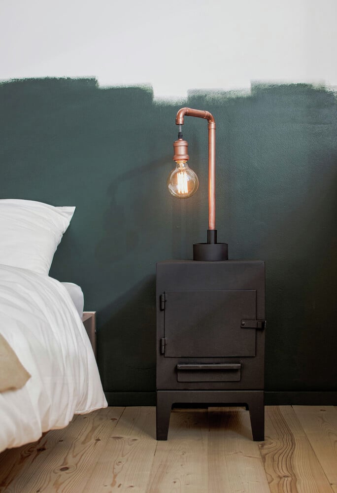 Many items in the interior have new function. For example the bedside table – modernized steel heating stove with the integrated lamps made of copper pipe and fittings. The dining table was made of pine furniture board and balusters as the legs. The dark green dresser in the bedroom is a repainted pine kitchen cupboard and balusters. Medical bottle of dark brown glass are used as decor. Visit INT2architecture.
