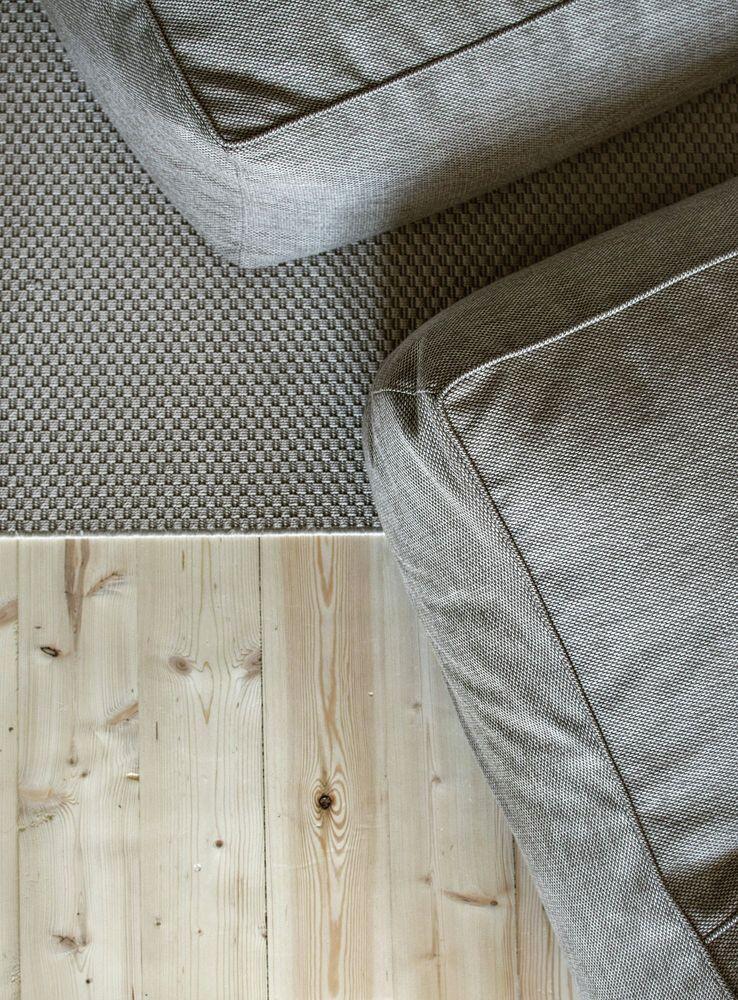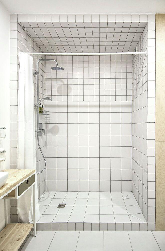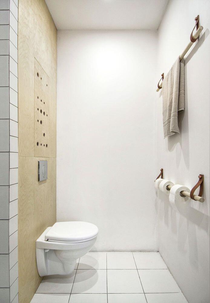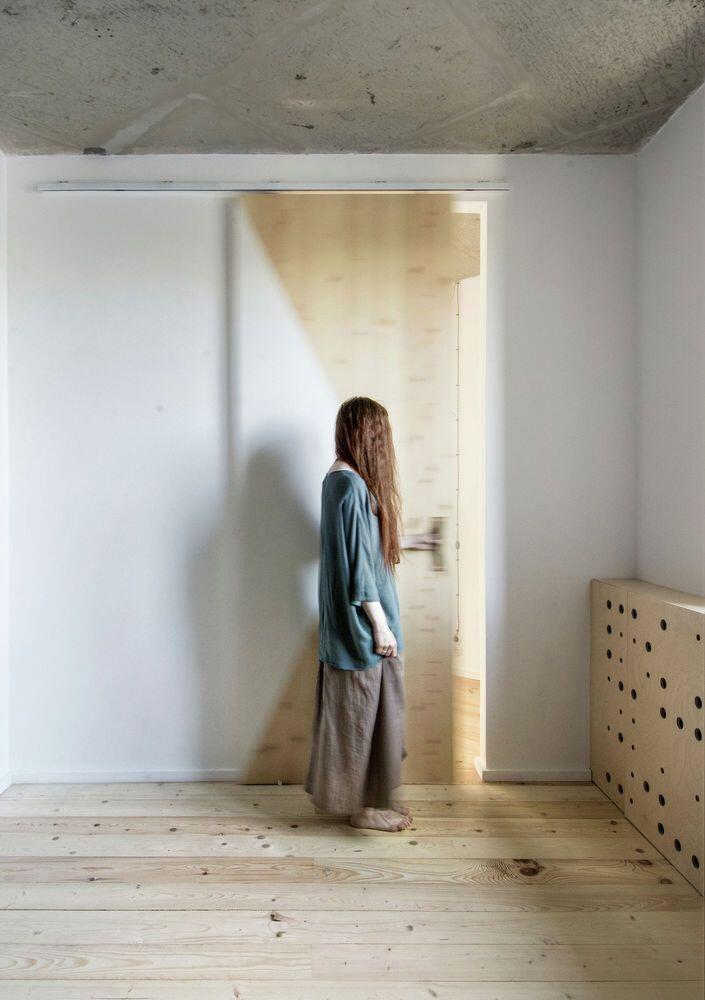 Materials used in this project are inexpensive and readily available: hardwood pine floors, white ceramic tiles, birch plywood. Concrete floors in the hallway and on the balcony and concrete ceiling are left unfinished only covered with the protective satin varnish.