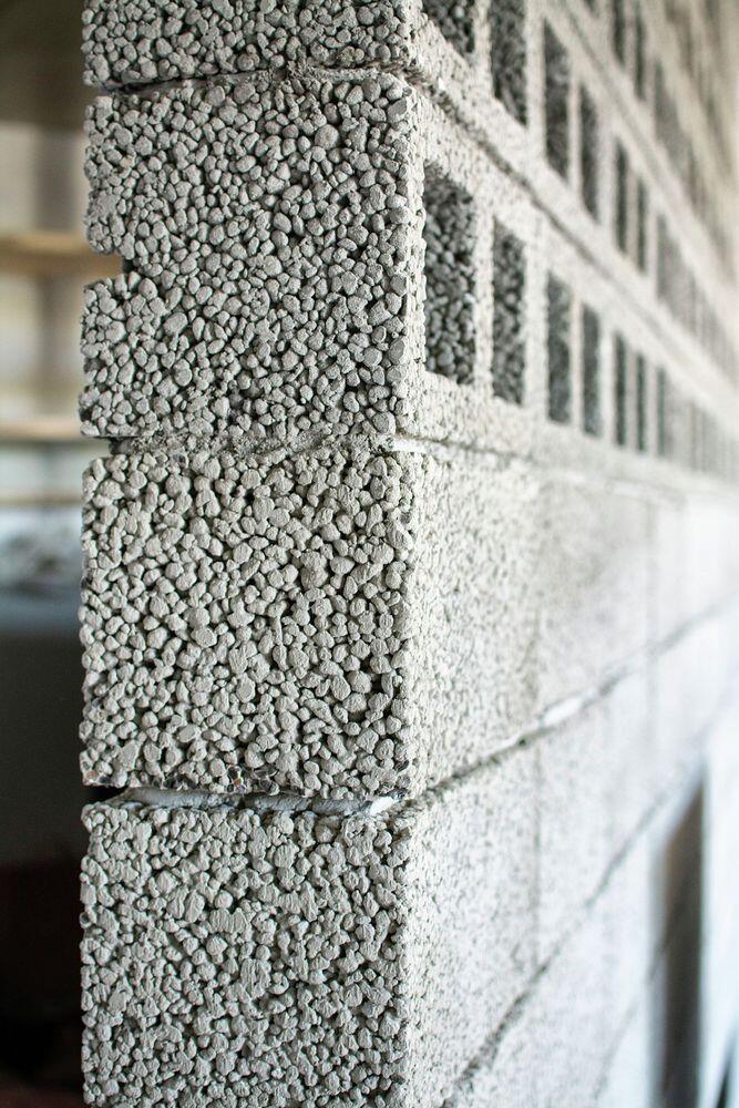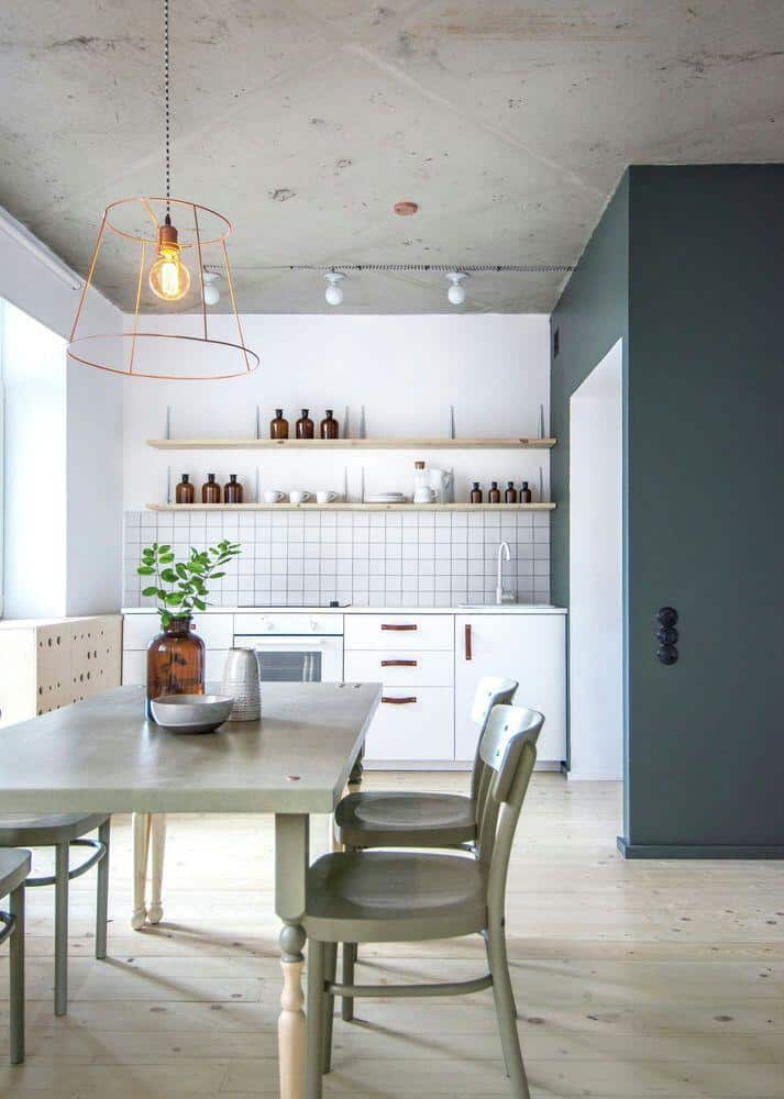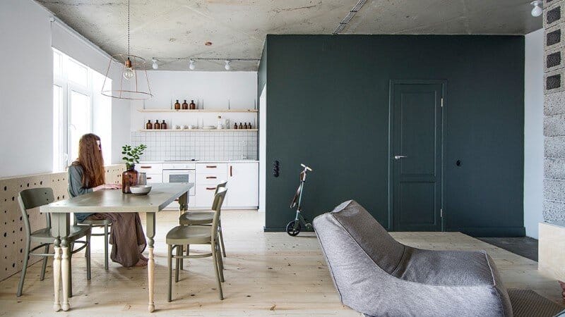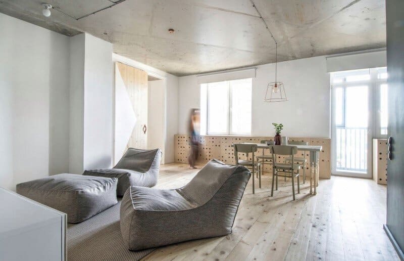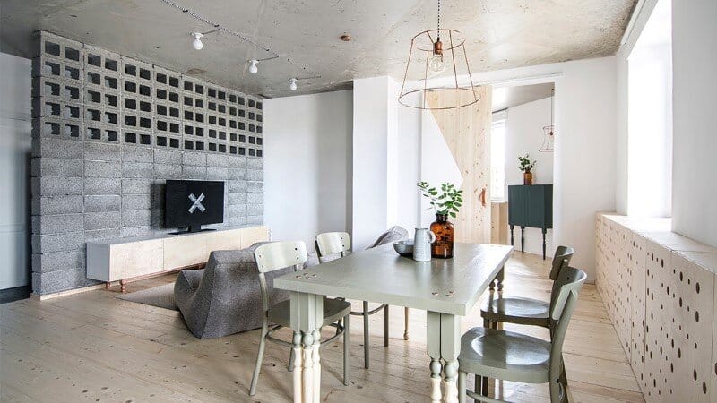 Description by INT2architecture: Space is divided into a common area, a hallway, a bedroom, a bathroom and a balcony. These beautiful interiors includes a kitchen, a dining room, a laundry room and a lounge area. The entrance hall with a spacious walk in wardrobe is separated from the living room by the concrete block partition wall that allows natural light into the wardrobe space through ventilation blocks in the upper rows. The sliding door in the living room leads to an isolated bright bedroom. Balcony is left empty at the discretion of the future tenants: for the possible bicycle storage or breakfast area.