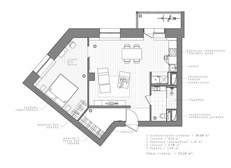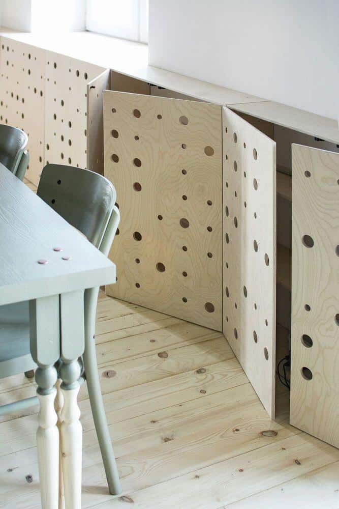 Plywood construction along the windows is a storage space for books, tableware, souvenirs, etc., as well as a decorative screen for the radiators. Holes on the facades play the role of handles, as well as the role of lattice for the heat circulation during the cold season. The pattern of the holes is not accidental, it is an encrypted message to the future tenants.