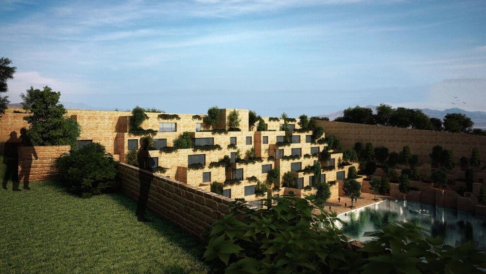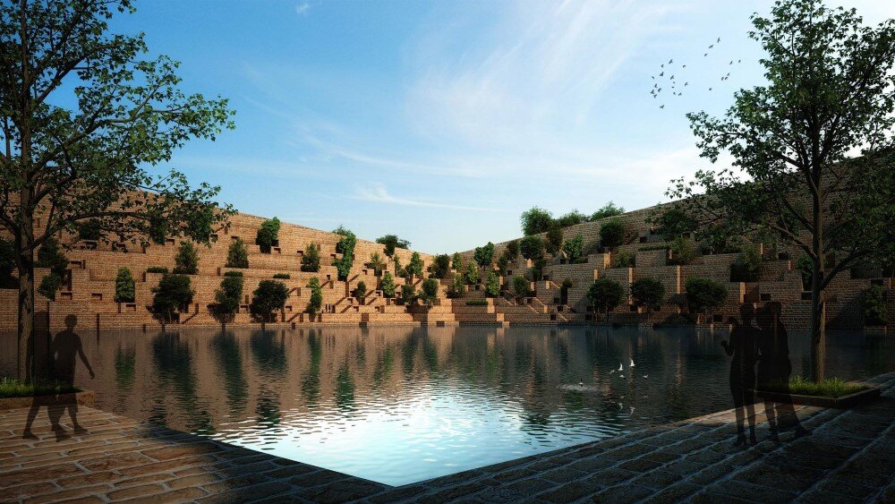 Description by Sanjay Puri Architects: This site is located in Rajasthan amidst desert land where water is a scarcity and temperatures are in excess of 40 ° C through 8 months of the year. The site is steeply contoured and the land forms a natural water collection pit from the surrounding land. To capitalize on the water collection that the site naturally has, stepped wells located in Rajasthan since centuries were studied and the design of the built form is directly inspired by the form of the ancient stepped wells.