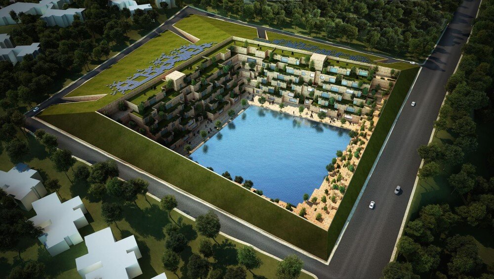 Description by Sanjay Puri Architects: This site is located in Rajasthan amidst desert land where water is a scarcity and temperatures are in excess of 40 ° C through 8 months of the year. The site is steeply contoured and the land forms a natural water collection pit from the surrounding land. To capitalize on the water collection that the site naturally has, stepped wells located in Rajasthan since centuries were studied and the design of the built form is directly inspired by the form of the ancient stepped wells.