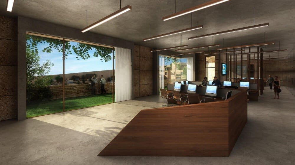 Externally the southern side is protected by earth berms that rise to create sheltered parking spaces with lower berms on the northern sides. The design is responsive to the site contours, the climate of its location and to the need of its users, generating office spaces that require much lower energy consumption due to their orientation while imbibing the traditional architecture prevalent in the region since centuries and creating a large water catchment area in response to the water scarcity. The entire structure will be built in local Chittorgarh sandstone available in close proximity of the site.