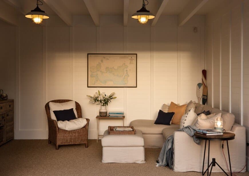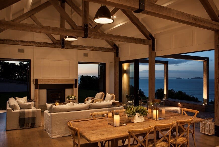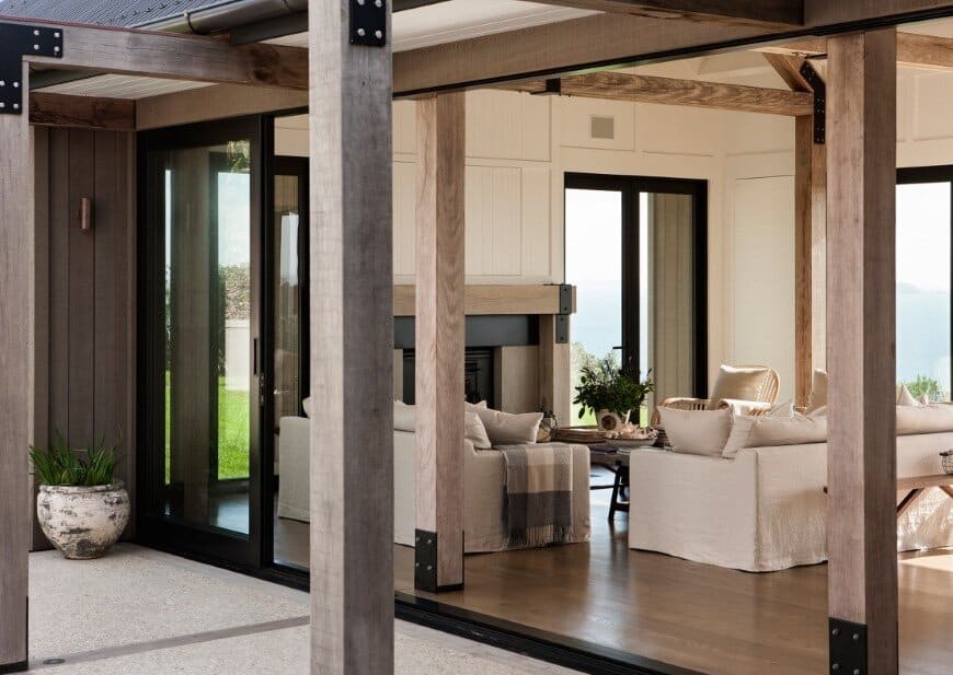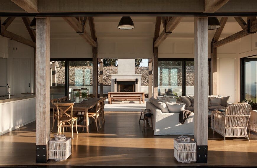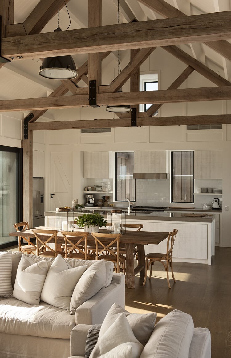 Naturally weathered hardwood timbers for posts, beams and trusses provide a structural rhythm along the central axis which is reinforced with expressed steel brackets. Interior and exterior styles are unified through the use of natural materials, including white-washed TGV soffits and interior linings, stained cedar siding and corrugated aluminium roofing. Concrete paving is rendered in locally sourced chip, which not only reflects a coastal aesthetic, but performs well in marine conditions.