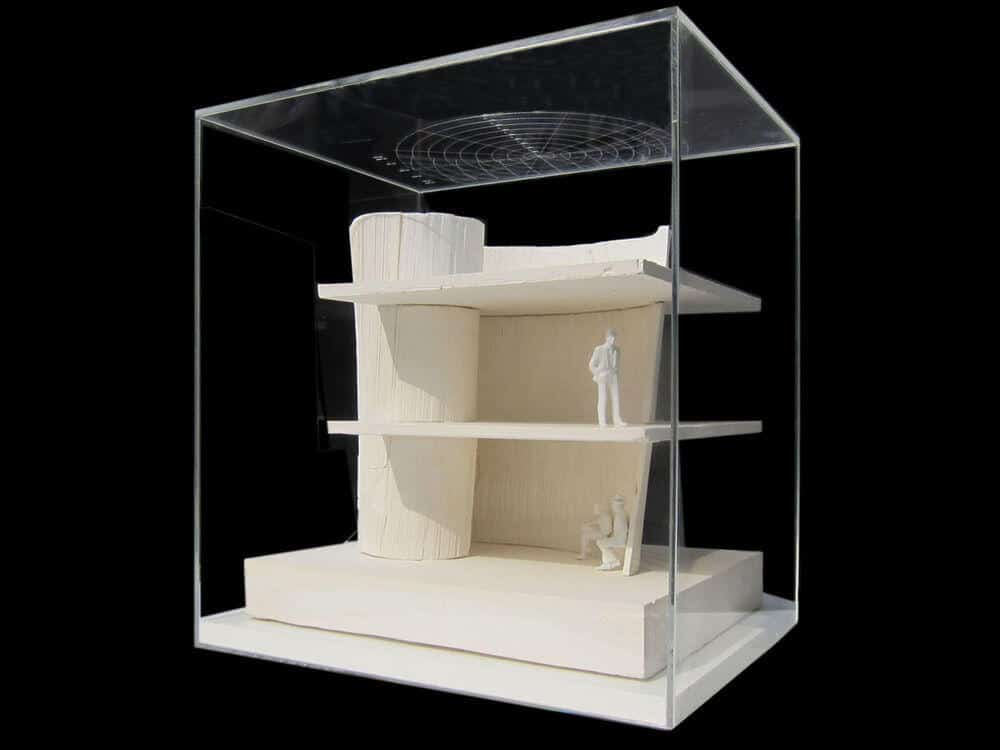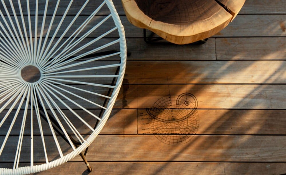 The top edge of the curved wall is rotated 11.25º in respect to the existing building and the site lines in order to face North. In the middle of the wall inside the box, the curve is parallel to the existing house. On the ground floor the curve is 11.25º towards the middle of the garden. The rotation point of this 22.5º twist is inside the flue of a pizza oven, which is in the center of the staircase leading to the sun. This spiraling construction is like the eye of a tornado.
