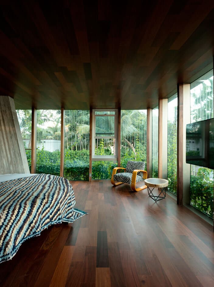 On the roof deck the curve follows the exact path of the sun at 25º48’55” North on June 21, the longest day of the year. As a solarium wall it reflects the sunlight onto the surface of the deck as the wall blocks wind, thereby imparting a sense of calm. Inside the vine-covered master bedroom this curving wall surrounds a round bed and hides the open bathroom.