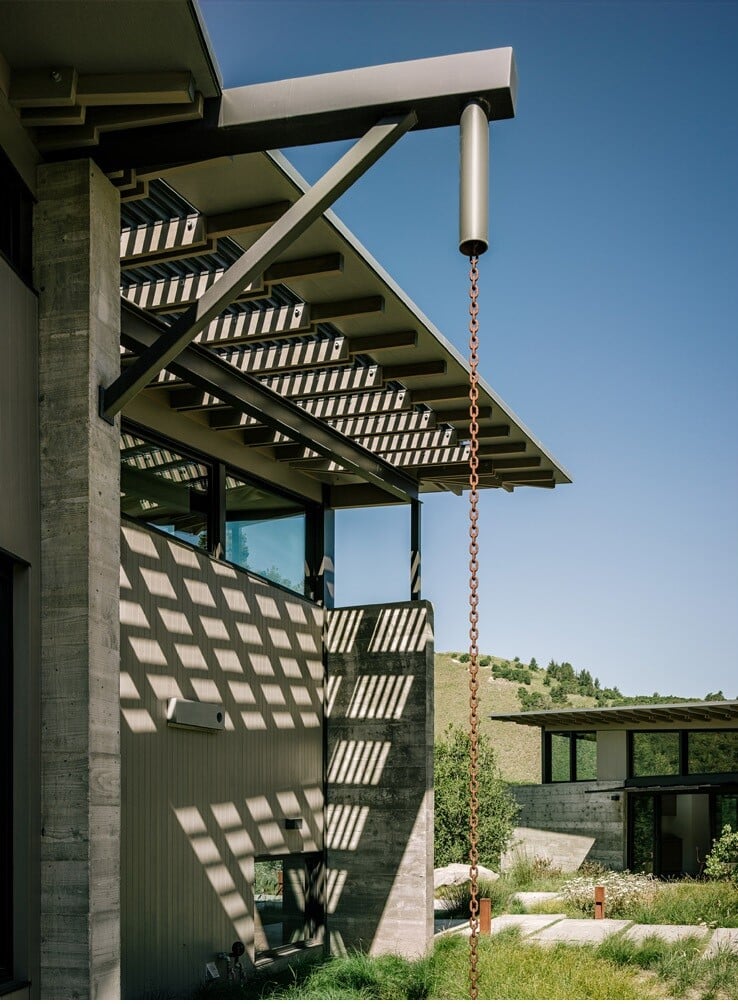 Beyond poetic gesture, the butterfly roofs bring in views of the surrounding hills, expand the main living spaces into the outdoors and also harvest rainwater. Water, an increasingly limited resource, is celebrated throughout the design. Each roof funnels water to a rain chain fountain and into landscape collection pools, which then gather in cisterns where it is stored and used to irrigate the landscape. In addition, the pavilions were sited to allow storm water to flow under the office bridge during the rainy season and seep slowly into the ground in the main courtyard.