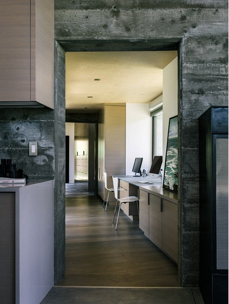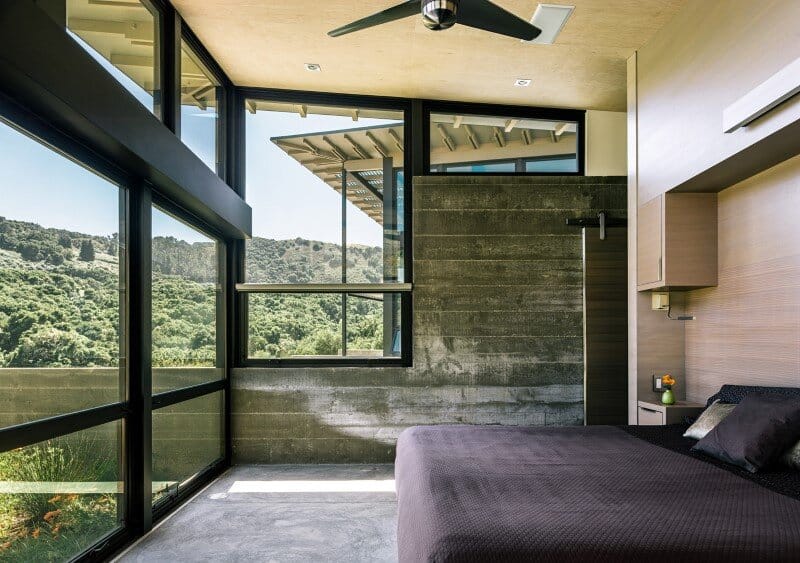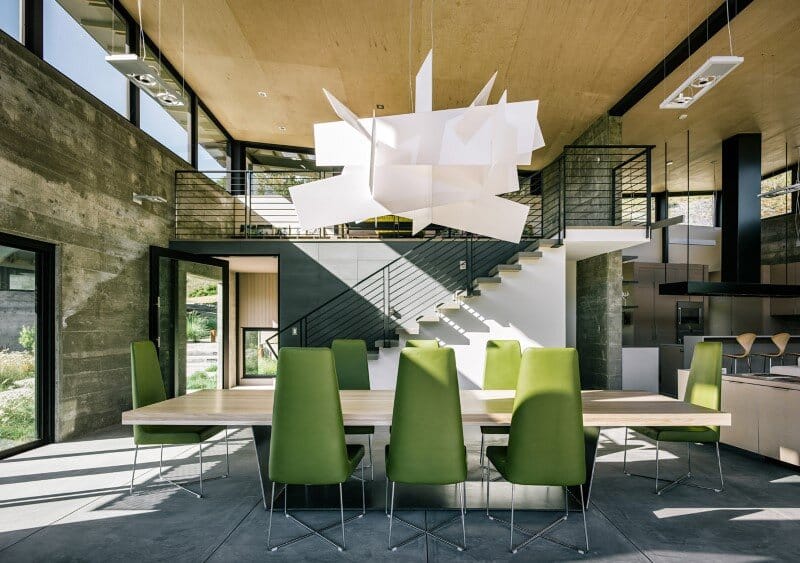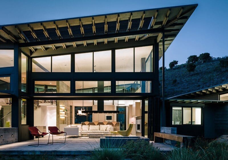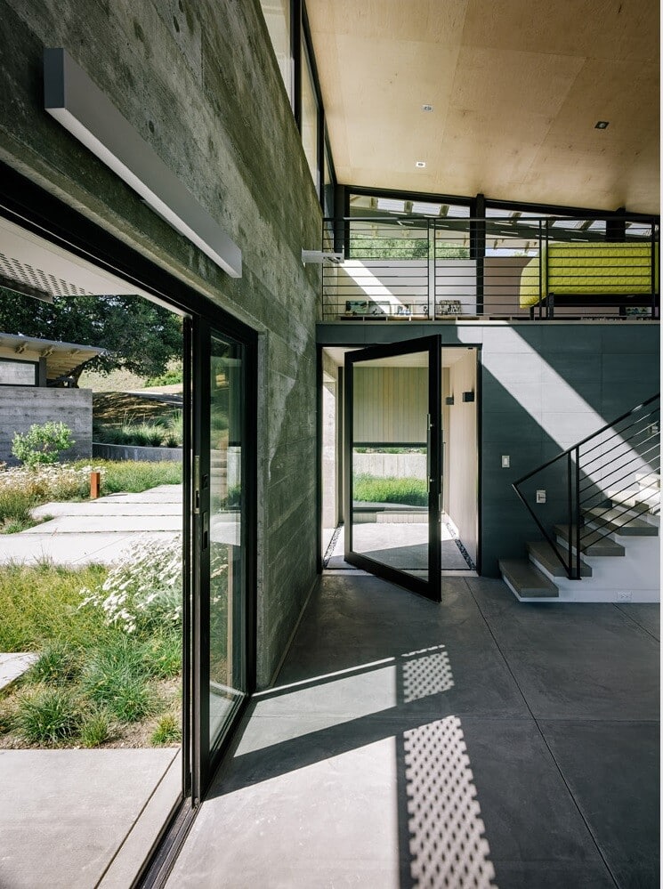 The neutral palette of the house—concrete floors and walls, large glass openings, plywood ceilings, and steel structure—flows from indoors to outdoors. The use of concrete and large expanses of glass acts as a heat sink—absorbing heat from the sunlight all day and releasing that heat at night. The house uses little energy as a result of extensive daylighting and passive thermal strategies. A large solar array located out-of-sight provides much of the energy that is used.