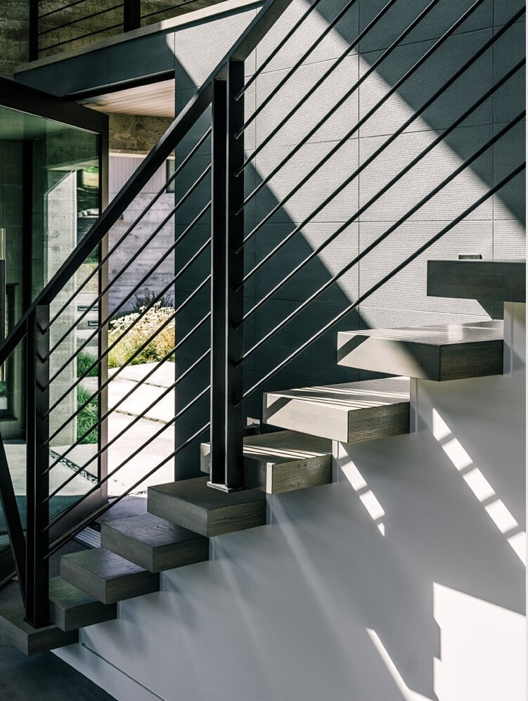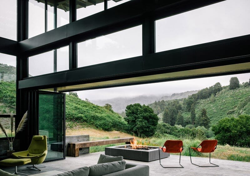 The clients were meticulous in the selection of the site, searching for two years for a spectacular piece of land that was flat enough to accommodate living on one level. In an initial meeting with Feldman Architecture, the clients noted their vision of butterflies alighting on the meadow site, which the architects took as inspiration. They also expressed a desire to integrate indoor and outdoor spaces with a simple, modern aesthetic and to provide separate spaces for their visitors.