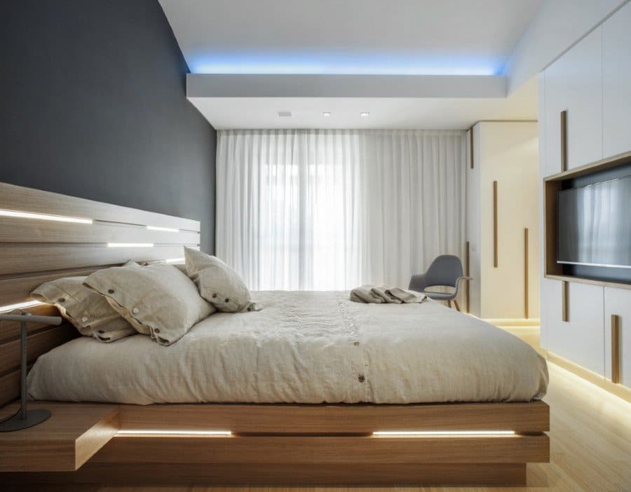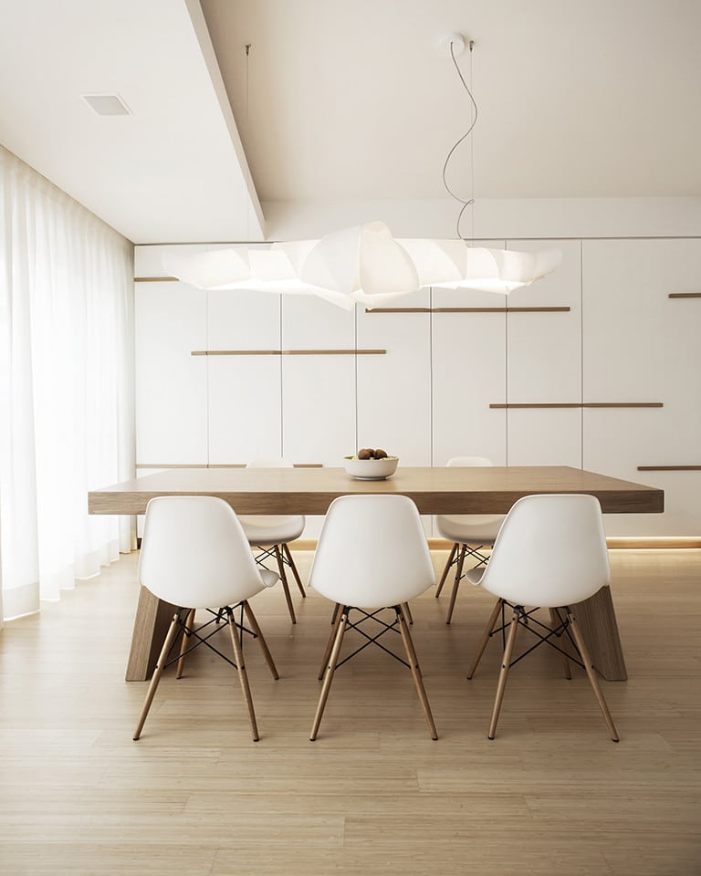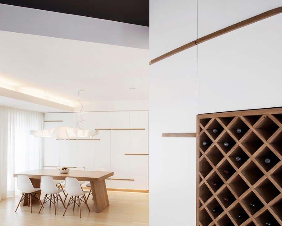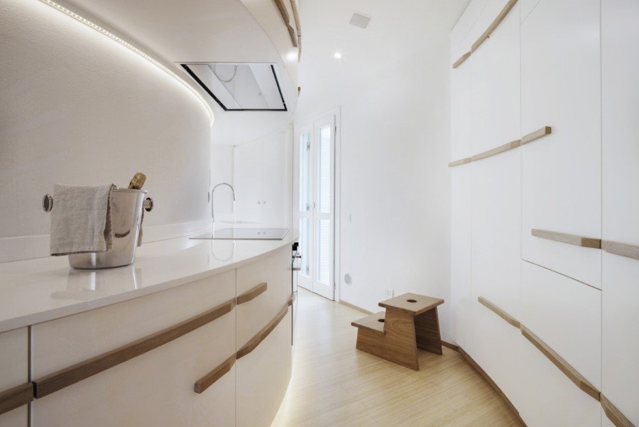 The lighting project is complex, conceived to offer many options for modulating a great number of lighting parameters to create changing scenarios over the course of the day and in each different space of the home. Even greater care, were that possible, was taken with the furnishings: everything is made to measure! Like the spectacular kitchen, designed by Studiòvo, with its surfaces describing an unusual, uninterrupted curve. A masterpiece of expert joinery that put the skills of the Officine 3076 craftspeople to the test: they not only built the furniture but were responsible for fitting them, like a hand into a glove, into the unfinished shell of the home. The kitchen also features high-tech professional appliances and is always stocked with a selection of typical, quality local food and wine products to welcome guests’ arrival.