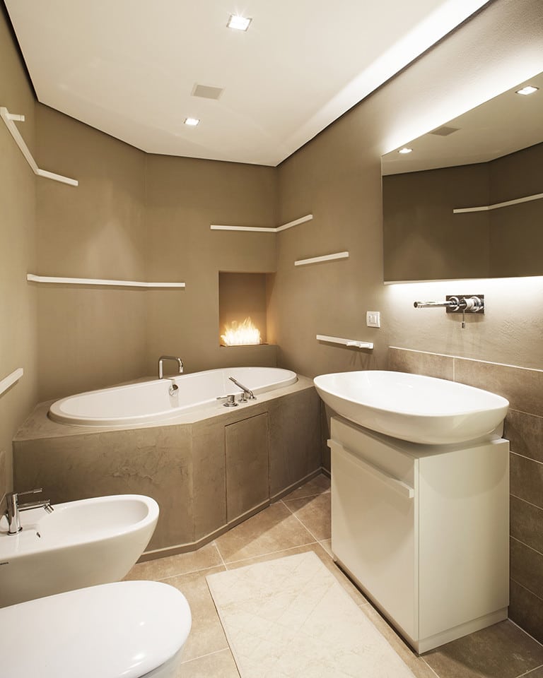 “Canticle” offers ample spaces: a 120-square-meter interior subdivided into a living area, two double bedrooms, two baths, a hammam, and an enormous terrace that projects the residence out over the city for (among other things) a splendid 360° view of the Lucca city walls and the broad surrounding swathe of green. “We propose furnishings that ‘break’ with the classic context of the historic center,” explain Marco Vincenzi and Andrea Caturegli of Studiòvo, the designers of the interiors and the terrace, and Amerigo Giannoni, of Officine 3076, the general contractor for the work. “We invested in lighting as a central element and we have given every single item making up the furnishings an identity: decorative, certainly, but also – and above all – functional.”