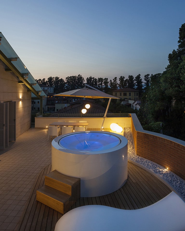 The terrace, unique in its genre, offers an intriguing view of the tree-studded Lucca city walls from three sides and is equipped for total relaxation with a teak solarium and heated infinity-edge minipool with hydromassage and chromotherapy capability.
