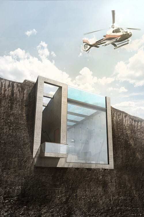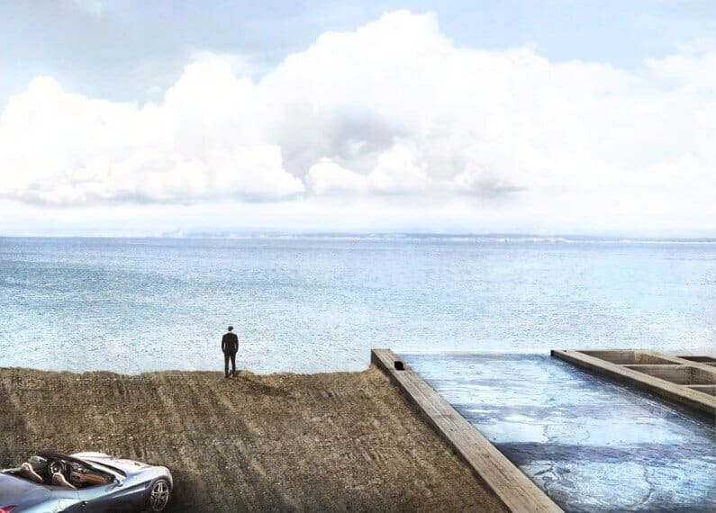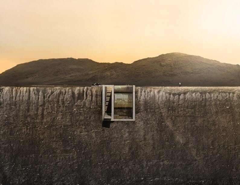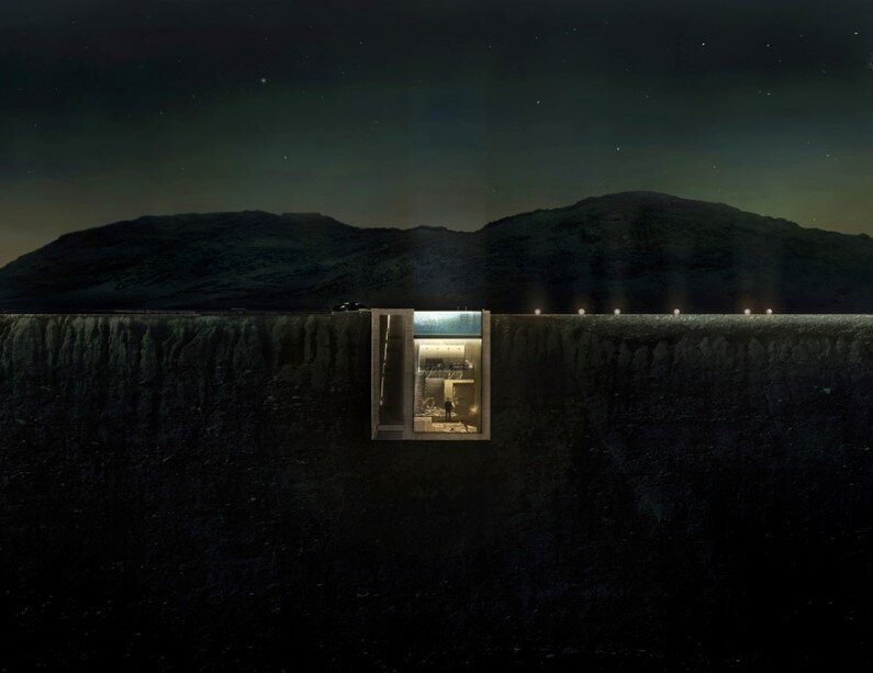 In literal groundbreaking integration, Casa Brutale penetrates the landscape. The underground building benefits from a perfect homeostatic mechanism with thermal insulation from the surrounding ground, and the cooling properties of the swimming pool. The optical impact of the building on the landscape is minimal, with only one façade on the cliff side and no volume extruding from the ground level.