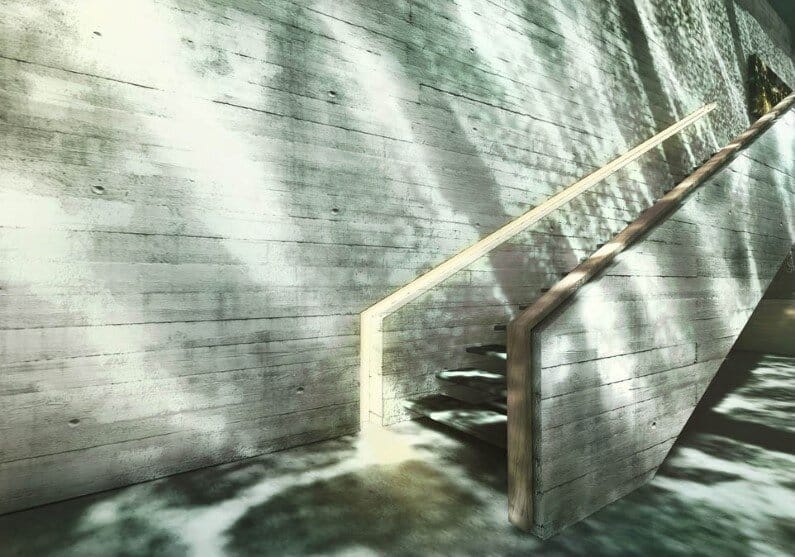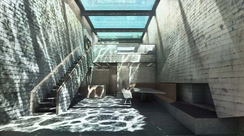 Light penetrates the transparent or semi-transparent surfaces of Casa Brutale, bringing it to life. The dynamic light patterns caress the bare concrete with refractions and shadows. Bare concrete, or beton brut, is the finishing technique that gave the name to both brutalism and Casa Brutale. Raw, unpretentious, monolithic, marked by the wooden planks used to mold the casting.