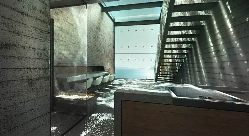After descending 50 stairs to the Aegean, under the shadows of epic concrete beams, you reach the entrance (also accessible by elevator). The tall, rotating door of aged wood (with the axis at ¾ lengths) opens to a breathtaking sea view, through the glass façade. The remaining space is bare, pure and simple; minimalism at its best. A concrete cast dining table is combined with concrete benches, clad with warm wood. Smooth curves sculpture the fireplace on the wall next to the bench. Behind the dining table, the guest room is formed under an old-fashioned Zoellner slab with a glass corner. Next to the guest room, there is a small passage to the utility rooms (storage room, bathroom and WC).