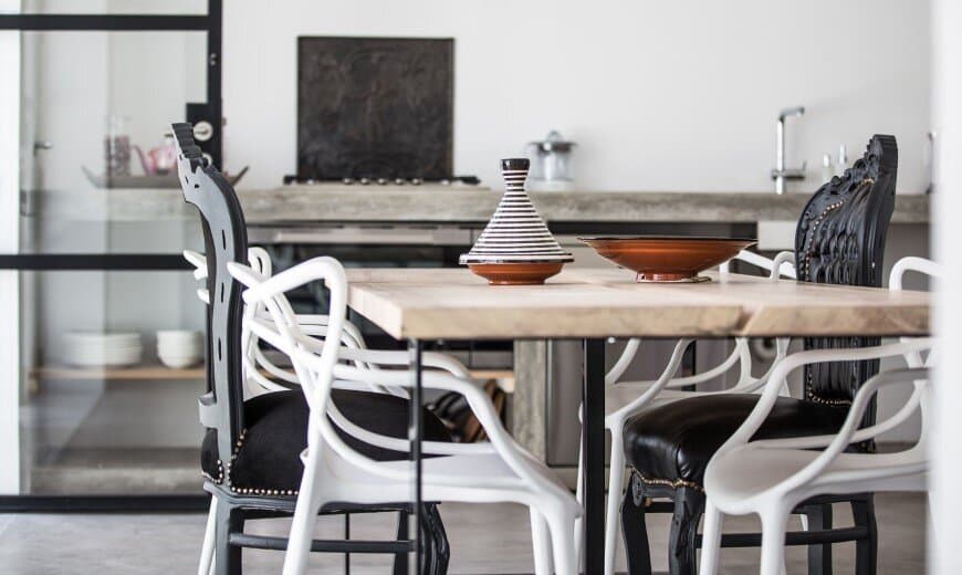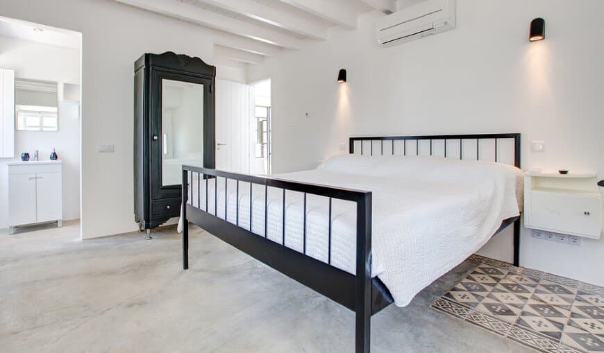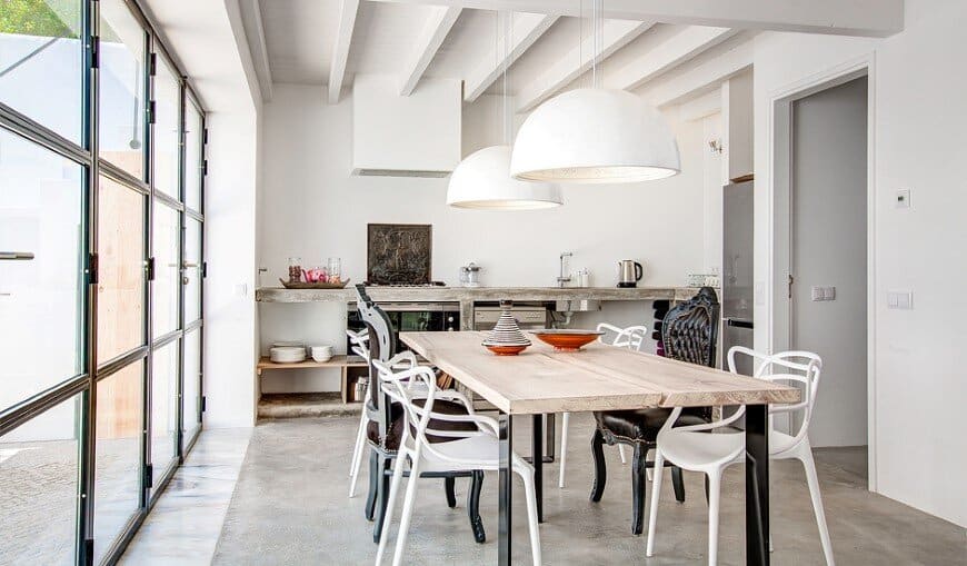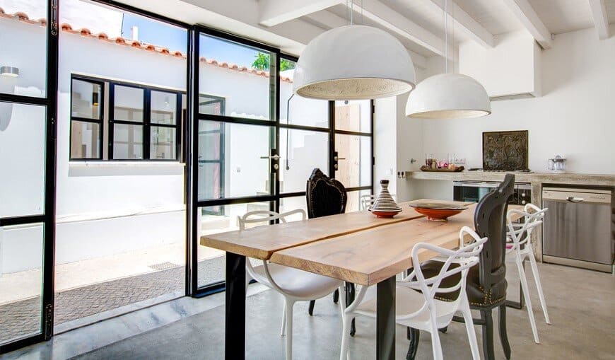 The home’s structural honesty is part of its charm. Exposed white-painted beams highlight the geometry of the ceilings, while stone flooring grounds the airy spaces. Generous full-height windows frame picturesque views of the surrounding countryside, seamlessly connecting interior life with the natural beauty beyond. These glazed openings also ensure cross-ventilation, enhancing comfort throughout the day.