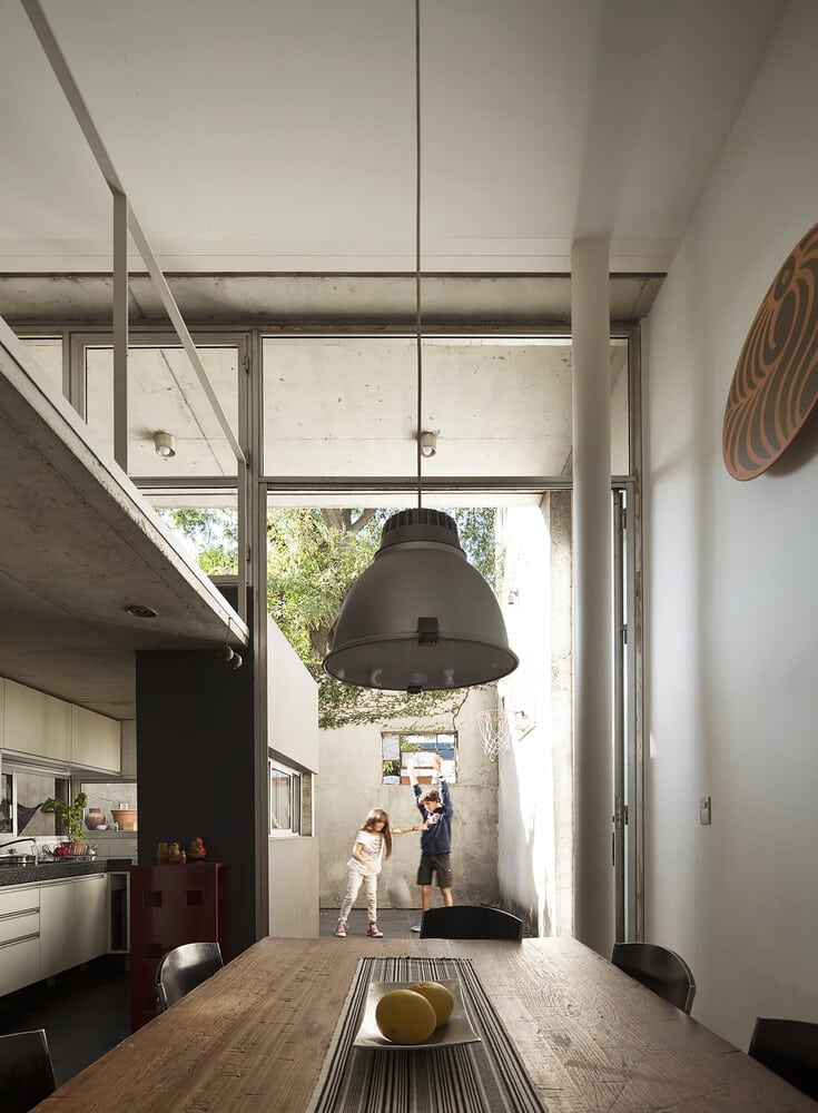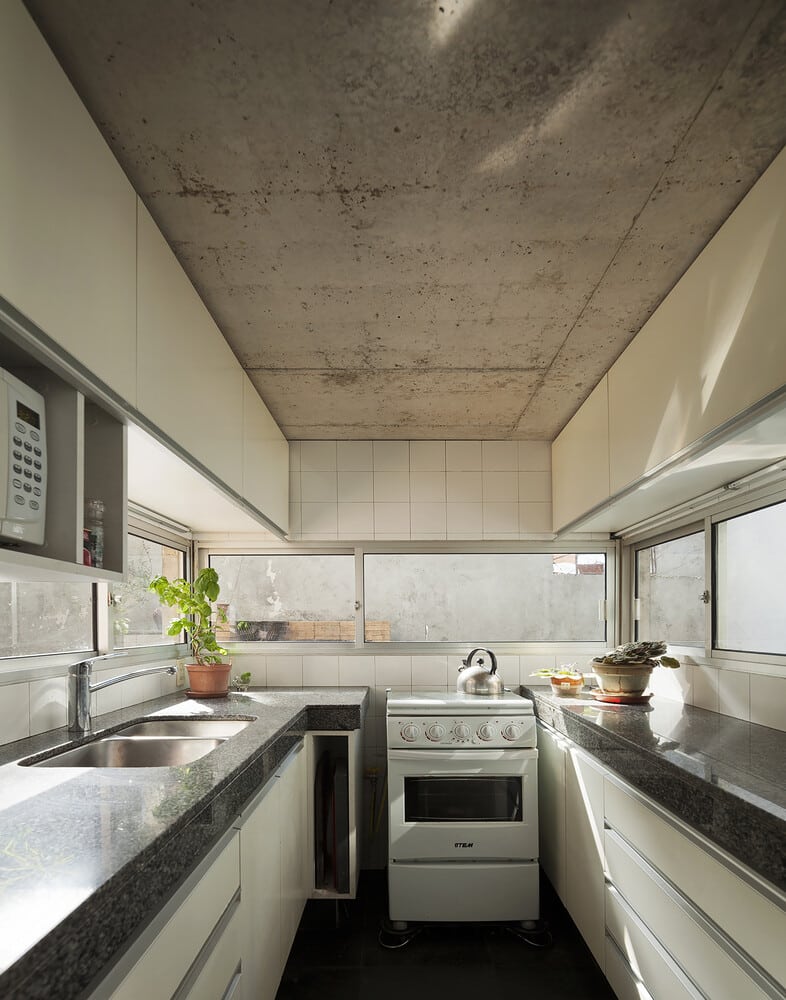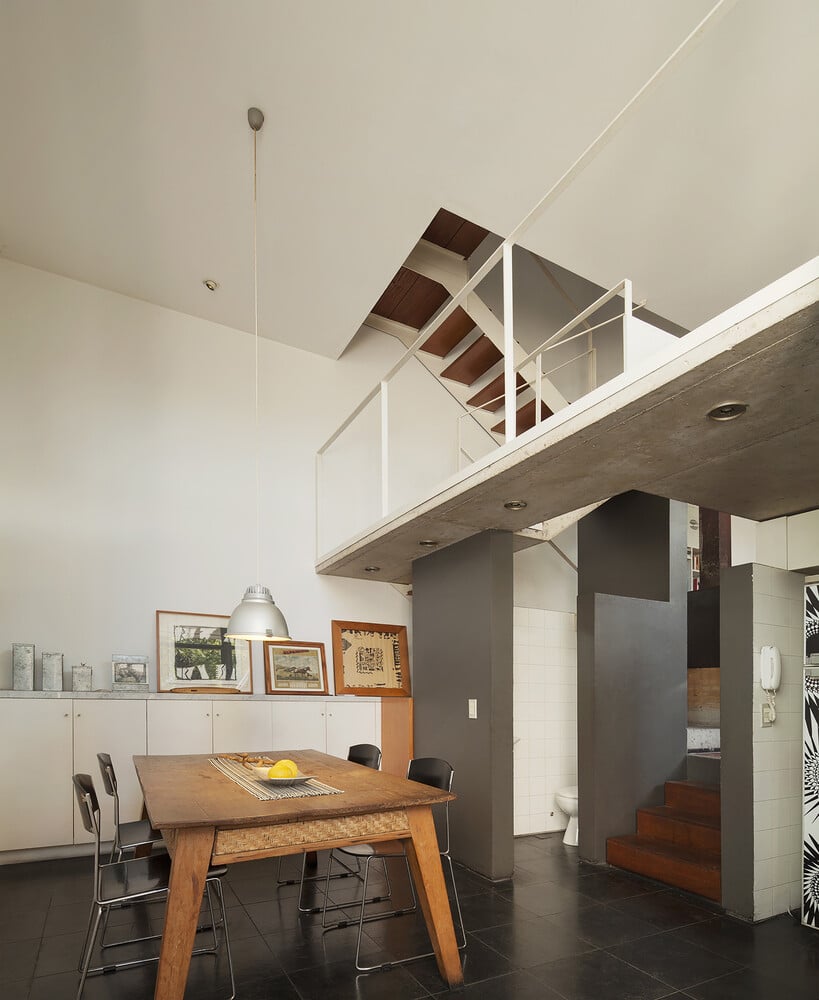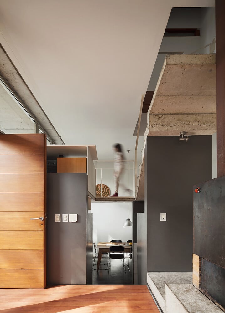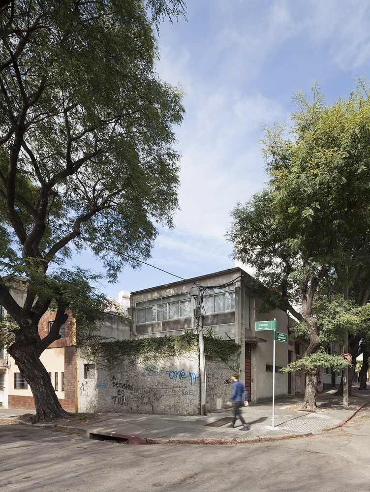 The architect’s description: The house is built on a small plot. It is an almost square corner, 72 m2, in a central area of the city of Montevideo. The thick wall that encloses the corner forms the outer expression of the house, as opposed to the thin glass skin that relates the interior space. The lower levels of the house, where we have the height of the existing building, deals with the social areas, creating an integrated domestic space from the visual point of view, and fragmented from the functional point of view. The upper level is reserved for the most private area of the house.