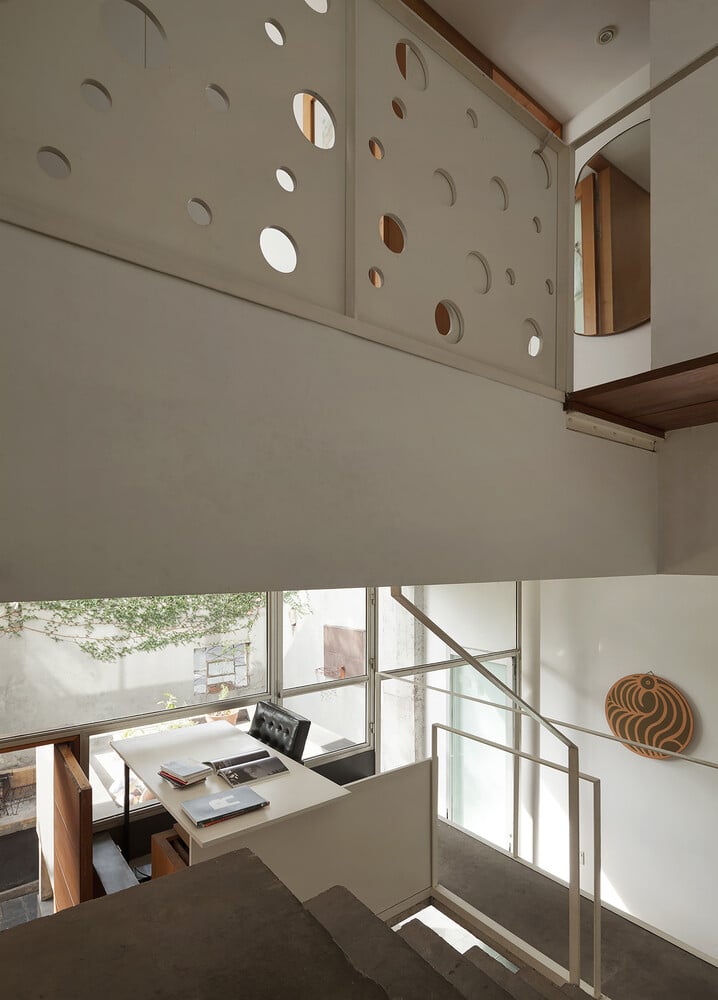 The project has two main themes, the geometry of the plan and the verticality of the interior space. The geometry produces a balance between interior and exterior space, almost fusing them with the transparency of the walls, the design on the different floor heights and the continuity of flooring, while the idea of vertical space tries to maximize the cubic meters relative the original few square meters, taking advantage of recycling the space but not tempted to subdividing it. Restrictions present the option of recycling, which enabled the complexity and spatial richness proposed by the house.