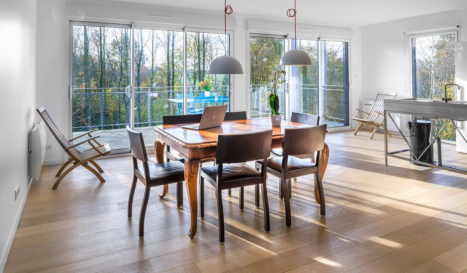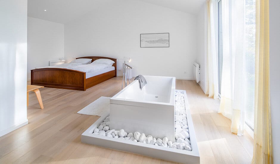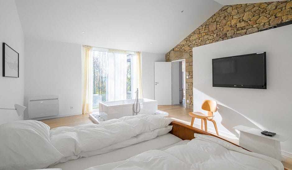 Hidden behind the historic stone façade is a modern interior with bright, open rooms, a fireplace, a sleeping loft and a bedroom with overflow bathtub. Inside, the house looks almost like a new building. The only reminders of the past are the stone walls in the bedroom as well as in the kitchen and dining area. This room is an extension with wooden facade and large windows offering views to the the surrounding landscape. Via UrlaubsArchitektur