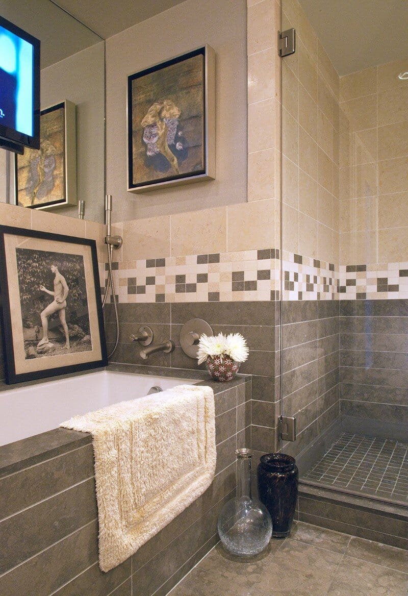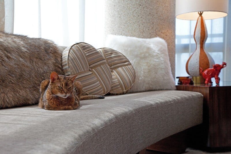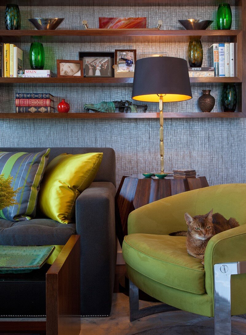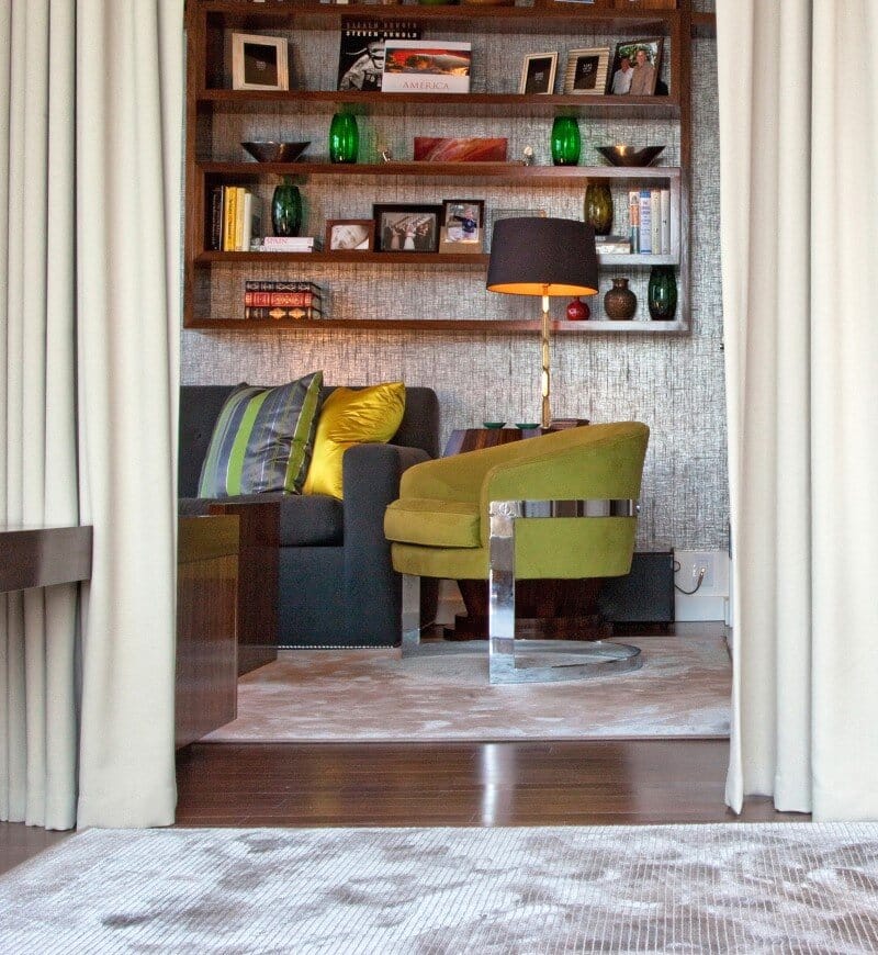 The goal in this design was to create something that was fun and glamorous with a strong masculine tone, like a beautifully tailored men’s with a snazzy tie for color. Therefore, it was no surprise that one of the owners, who has worked in fashion for nearly 20 years, offered up suggestions of gray flannels, deep burnt oranges and acidy greens, amidst a backdrop of taupes, grays and silvers.