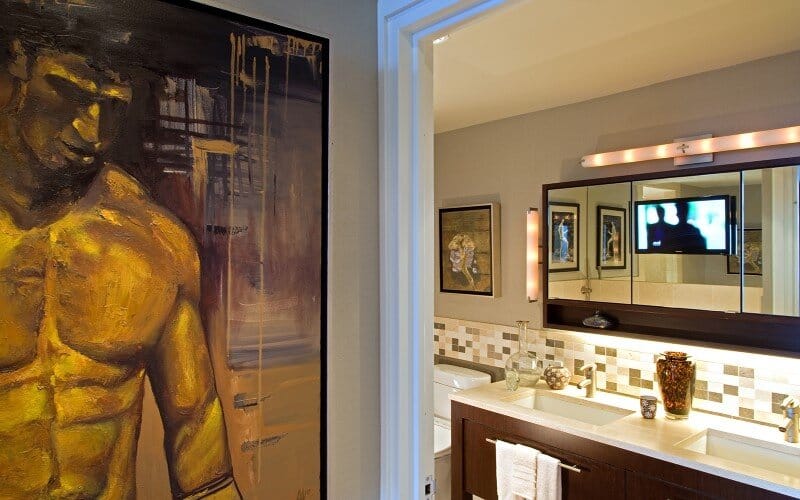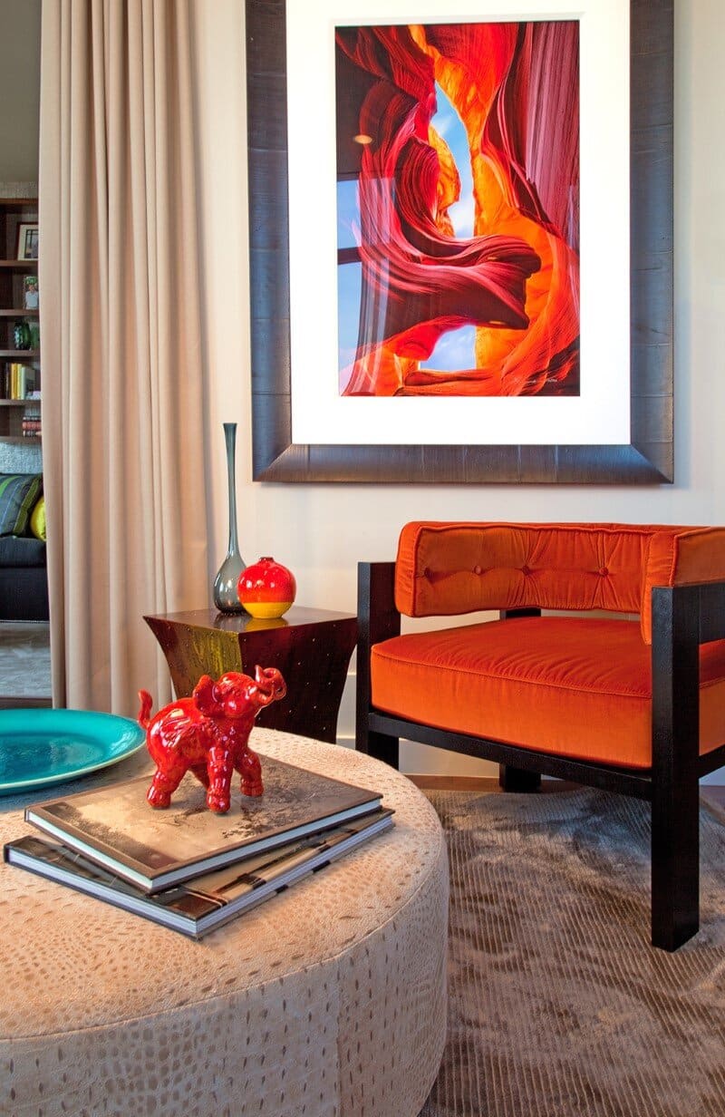 This color story found expression in all of the finishes, fabrics, and accessories, but in such a way that emphasized a unique vibe to each room. In each major space an earthy foundation on the walls and major upholstery pieces set the stage for intense splashes of color in the art and objects. Nothing of comfort was sacrificed for style, reflecting both the great personal style in a down-to-earth manner of the owners. Special thanks for creative consultation by Jeffrey King, Jeffrey King Interiors.