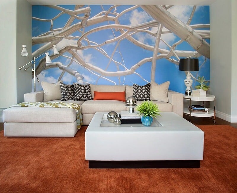 The owner has a deep respect for the traditions of his family, but we integrated them in a modern and more abstract way. We warmed the palette with a marigold color Tibetan wool rug, and created a feature wall of a large custom photo mural enlarged into dramatic wallpaper. A mix of dark and light woods, metallic finishes, and leather upholstery create instant warmth and texture to this living space.