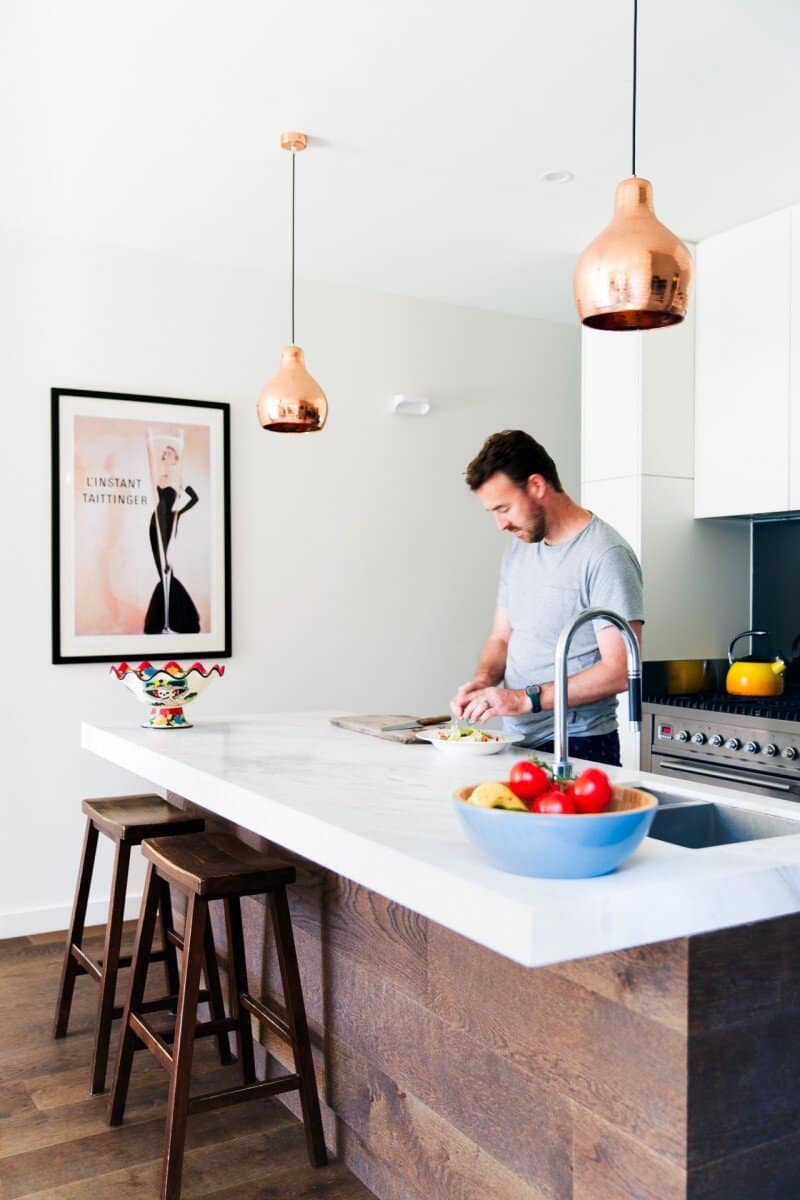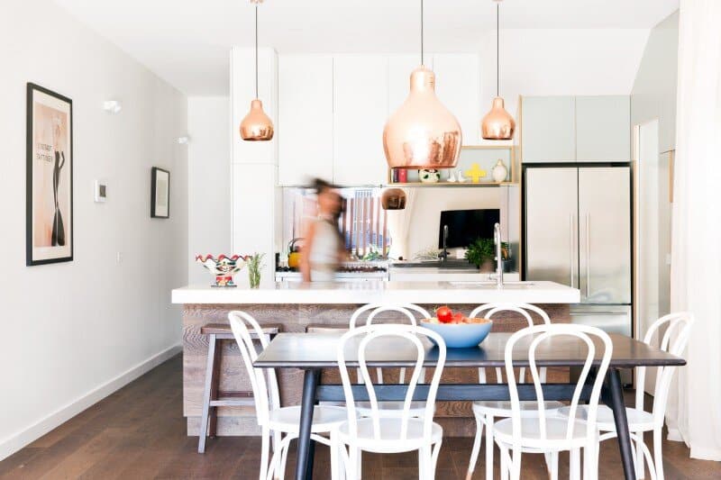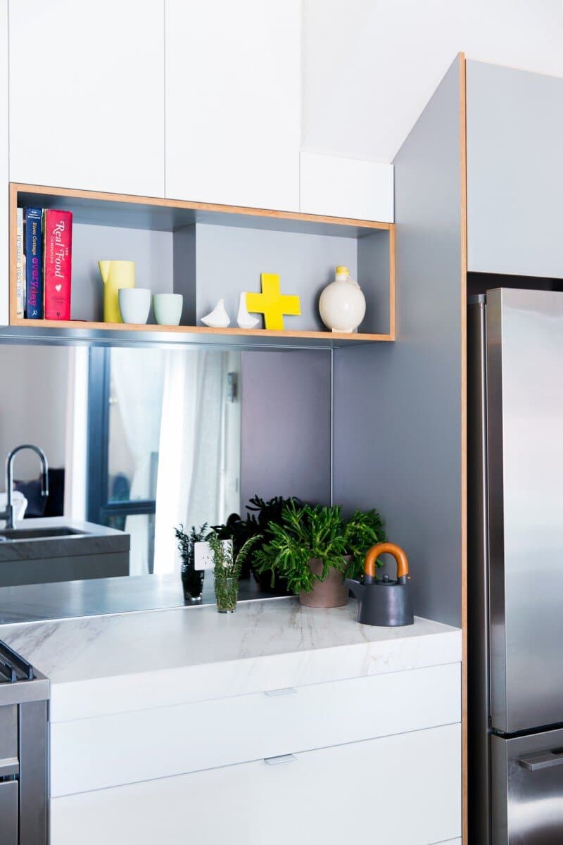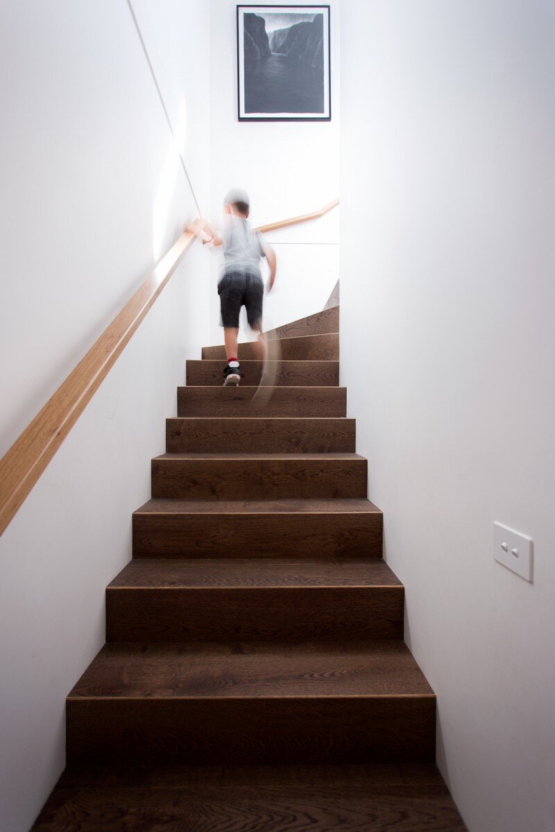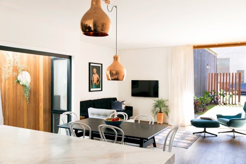The open plan living/dining/kitchen area is opened up to the front yard and is oriented north inviting the winter sun to light and heat up the room and also to allow natural ventilation to cool the room during summer months.