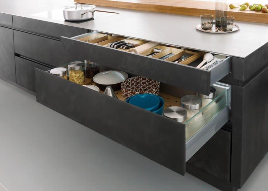 Concrete surfaces always have a distinctive appearance. The kitchen fronts of the new concrete have a genuine, hand-applied concrete surface. Leicht uses the special material properties and the appearance of the concrete material to its advantage, so as to bring prestigious kitchen concepts from modern to minimalist to life. Naturally, the possibilities to meet customers’ wishes regarding dimensions and form, are also available with the CONCRETE kitchen. Every kitchen front, every design element is hand made to the desired dimensions.
